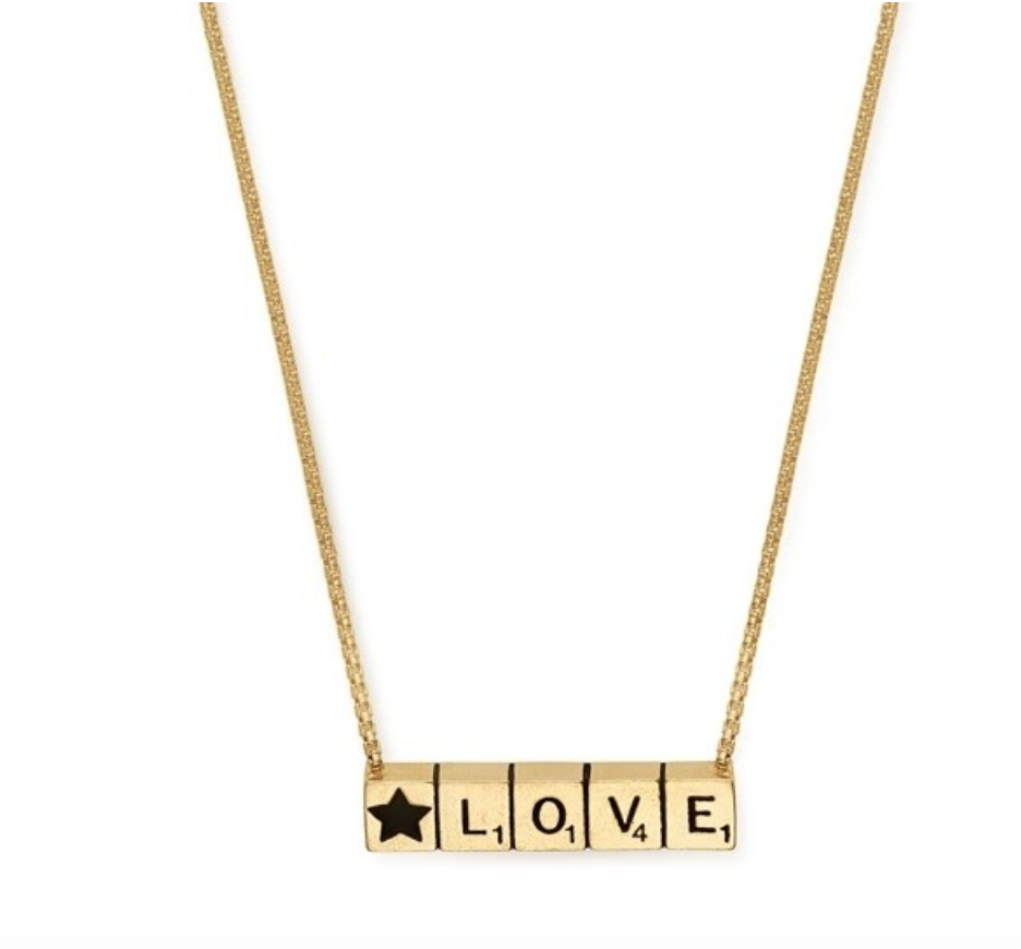 The collection is based on the iconic Scrabble game tiles featuring “L-O-V-E” and “X-O” designs.