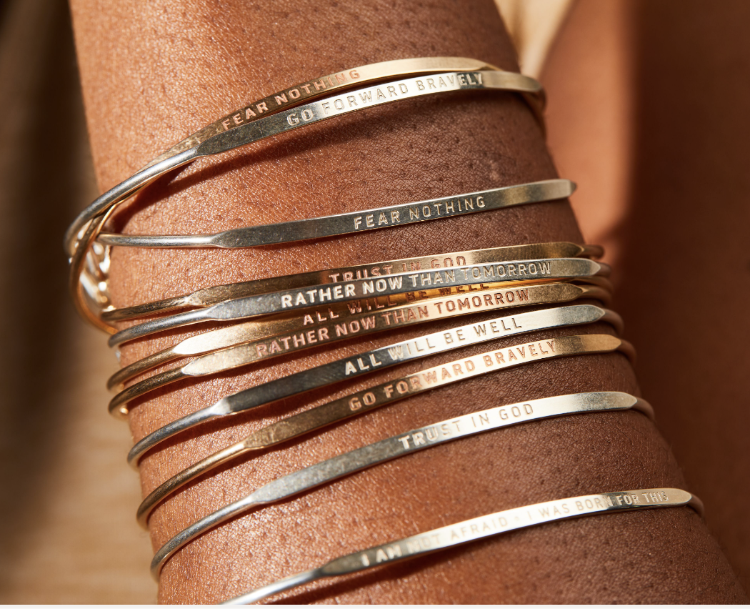 The bracelets are engraved with encouraging and inspiring phrases for the powerful women in your life, including “Rather Now Than Tomorrow,” “I Am Not Afraid, I Was Born For This,” and “Go Forward Bravely.”
