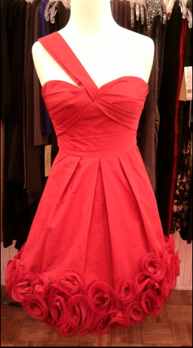 In terms of color, youthful, fresh colors of spring have largely replaced black in dresses of all styles, with creams, blues and corals leading the way. Taking a cue from the Hollywood, girls can make a star statement in a one-shouldered mini. For girls who want to make a red carpet entrance at prom, though, Maghadam suggests a BCBG Max Azria red one-shouldered party dress (below left) with playful embellishment at the bottom.