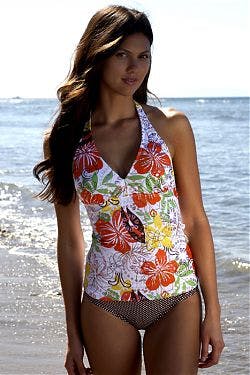 Black is great and we know why – it slims. But if you can’t come alive with color in the summer, when can you? Think of the lure of sea-blue turquoise or sizzling coral. Or what about small colorful graphic prints or tropical flowers? Just make sure the cut of the suit works for your body type. If you can’t break the black habit, at least look for compelling dressmaker touches such as darts, unexpected bra-like features, or cool nautical piping.
