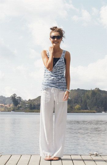 Ditch the shorts and opt for floaty wide-leggers in linen or silk. Top with a cotton camisole in a sherbet color and you have an elegantly romantic at-home look. Variation of the theme: replace the linen pants with cooling cotton pajama bottoms for easy midsummer nights dreams. Old Navy