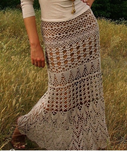 Take one slim creamy crocheted lace skirt and add a nubby cotton pullover. Keep it long and loose and push up the sleeves. Add a stack of bangles, a great ring, and jeweled sandals. You’re ready for that sidewalk bistro iced latte with friends.