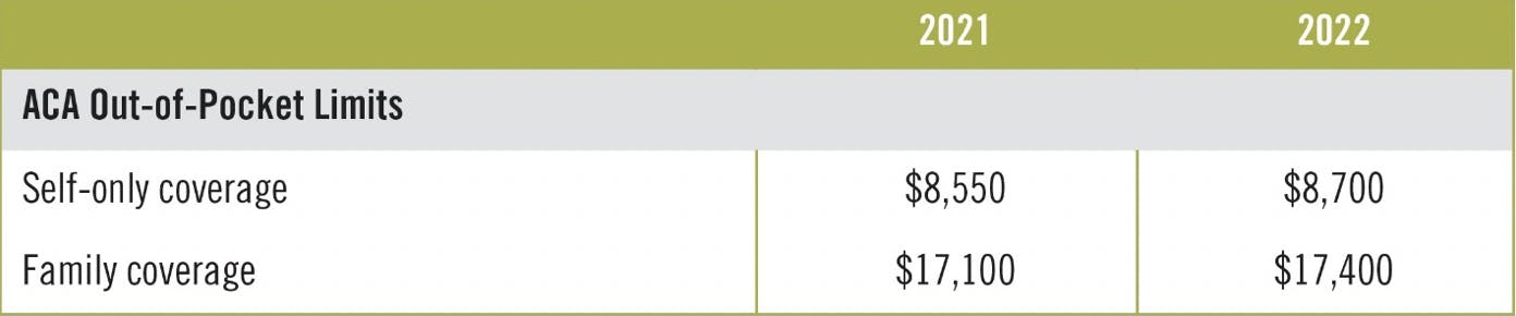 In addition, the Centers for Medicare and Medicaid Services (CMS) announced the 2022 maximum out-of-pocket limits for non-grandfathered health plans. To comply with the ACA, non-grandfathered health plans cannot have higher out-of-pocket maximums for essential health benefits.