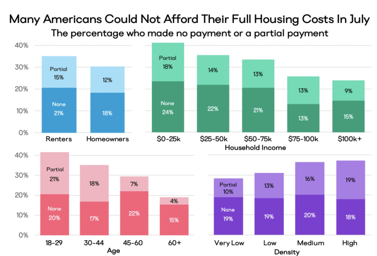 "Naturally, younger and lower-income households have more trouble than older and wealthier ones; for those under 30 years old and those making less than $25,000 annually, the missed payment rate exceeded 40 percent in July," said the report. "Missed payments also remain correlated with population density, and in medium- and high-density areas where the early spread of the virus compounded the existing stress of high housing costs, over one-third of residents are still finding it difficult to pay their bills."