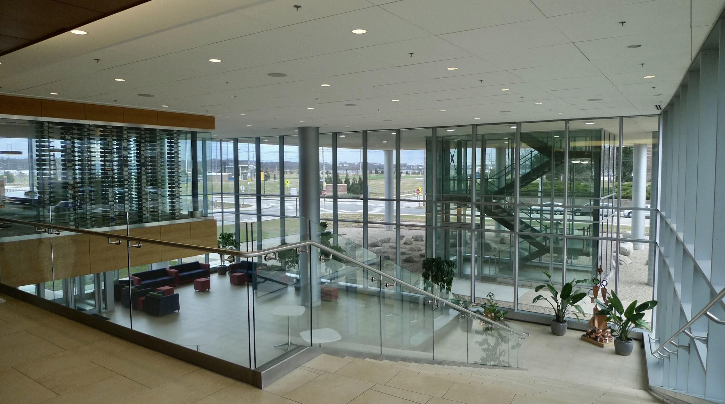 Because of the long, tall, and narrow proportions of the building, the classrooms are bathed in natural light and have sweeping views of Narragansett Bay.