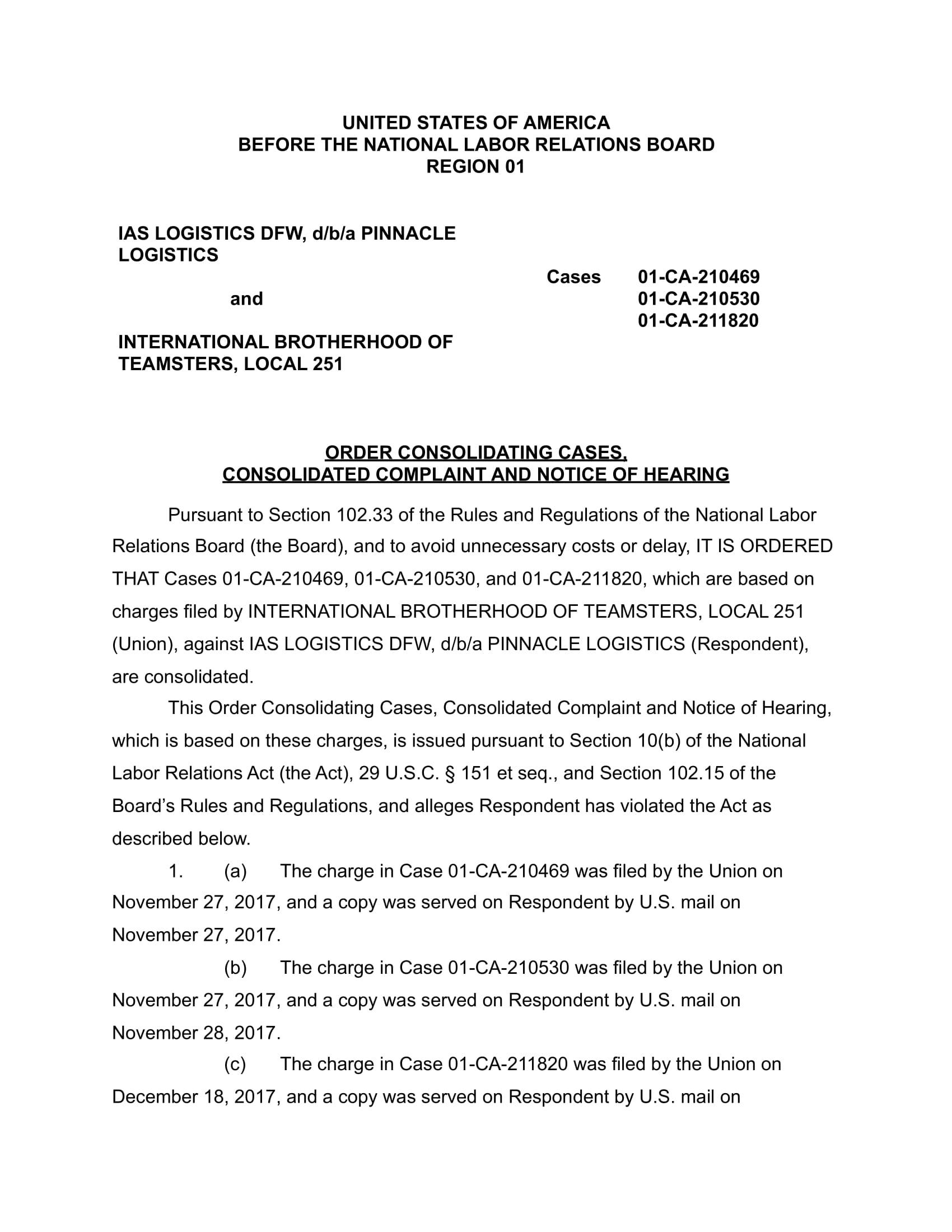 The order consolidating cases -- and providing notice of a hearing -- signed by NLRB Regional Director on February 28 -- alleges that Pinnacle, the respondent, violated the National Labor Relations Act, by "interfering with, constraining, or coercing employees in the exercise of their rights."