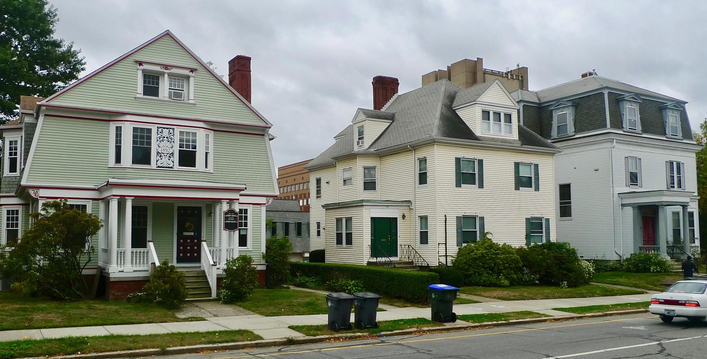 The large one on the corner is French Second Empire, the one in the middle is a Georgian Revival house, while the other is a well-preserved 1892 example of the Queen Anne style.