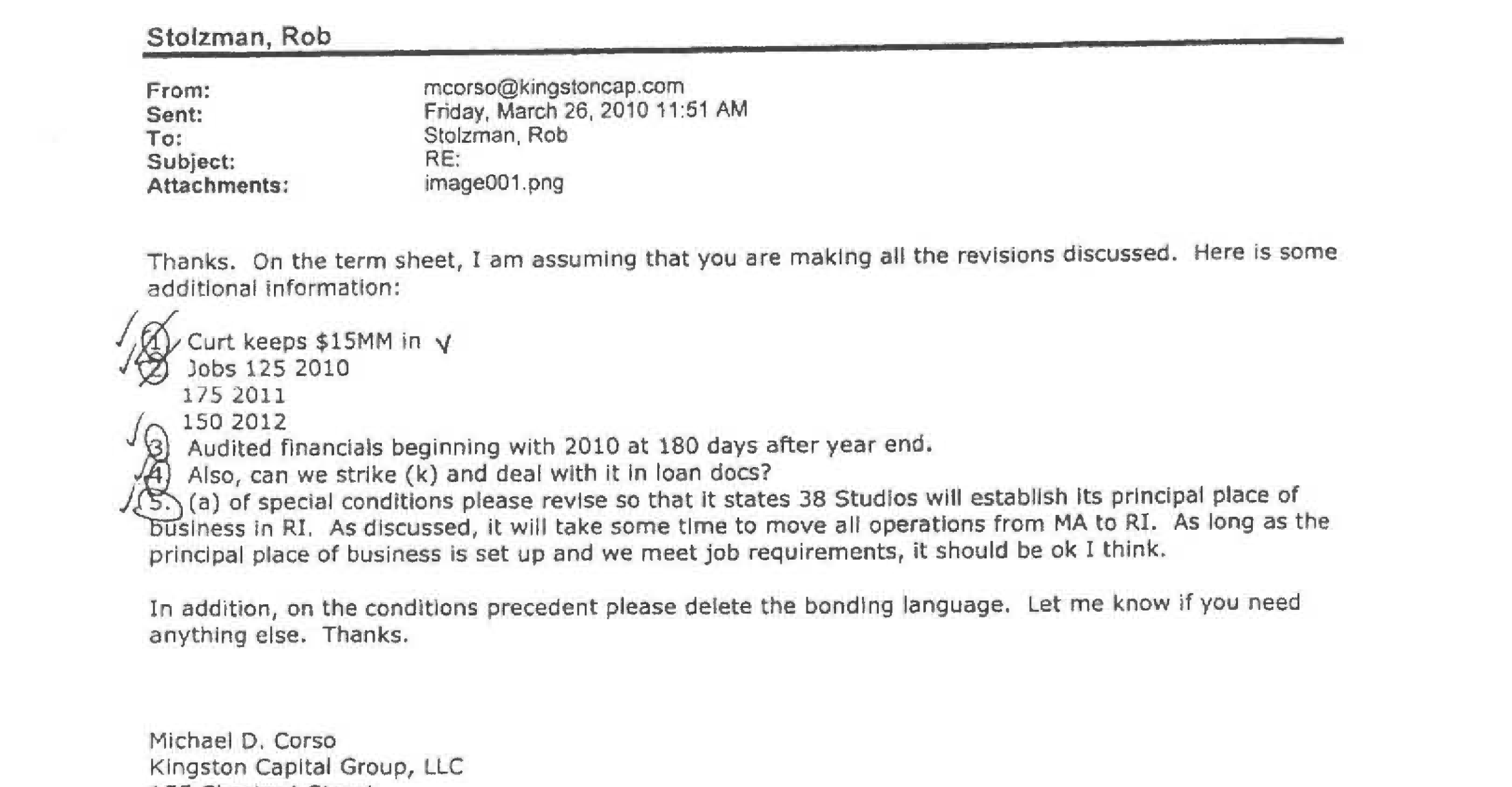 “Corso’s agreements with 38 Studio included a kicker of 5% of the $75 million Rhode Island funding for 38 Studios, which totaled $3.75 million.