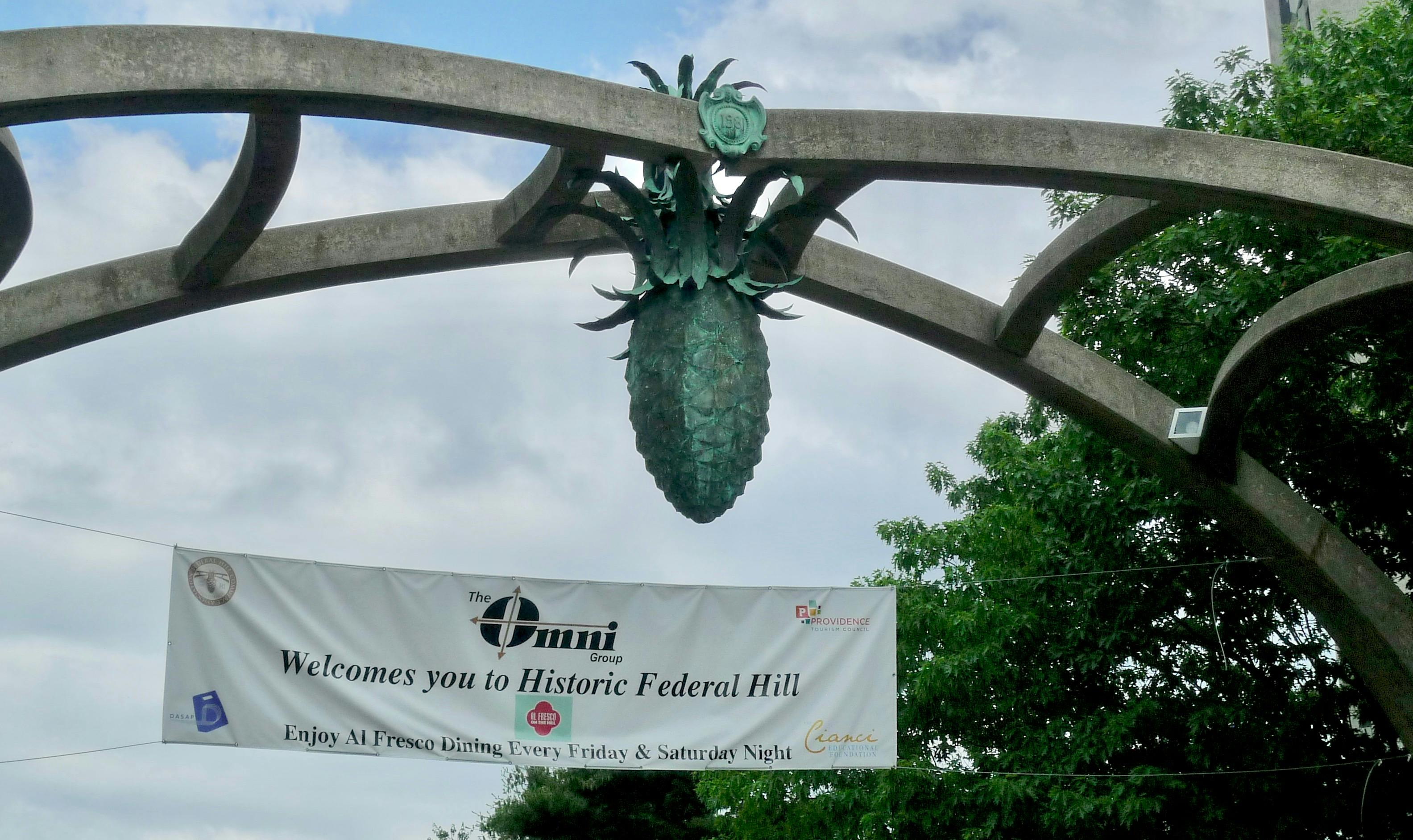 And the most prominent signifier of la vita Italiana is the so-called bronze pineapple suspended from the gateway arch at the eastern entrance to Federal Hill. Whether you care to think of this as a gesture of welcome or as Roman fertility symbol, "La Pigna" is partly obscured by a banner declaring that the Omni Group Welcomes You to Historic Federal Hill.