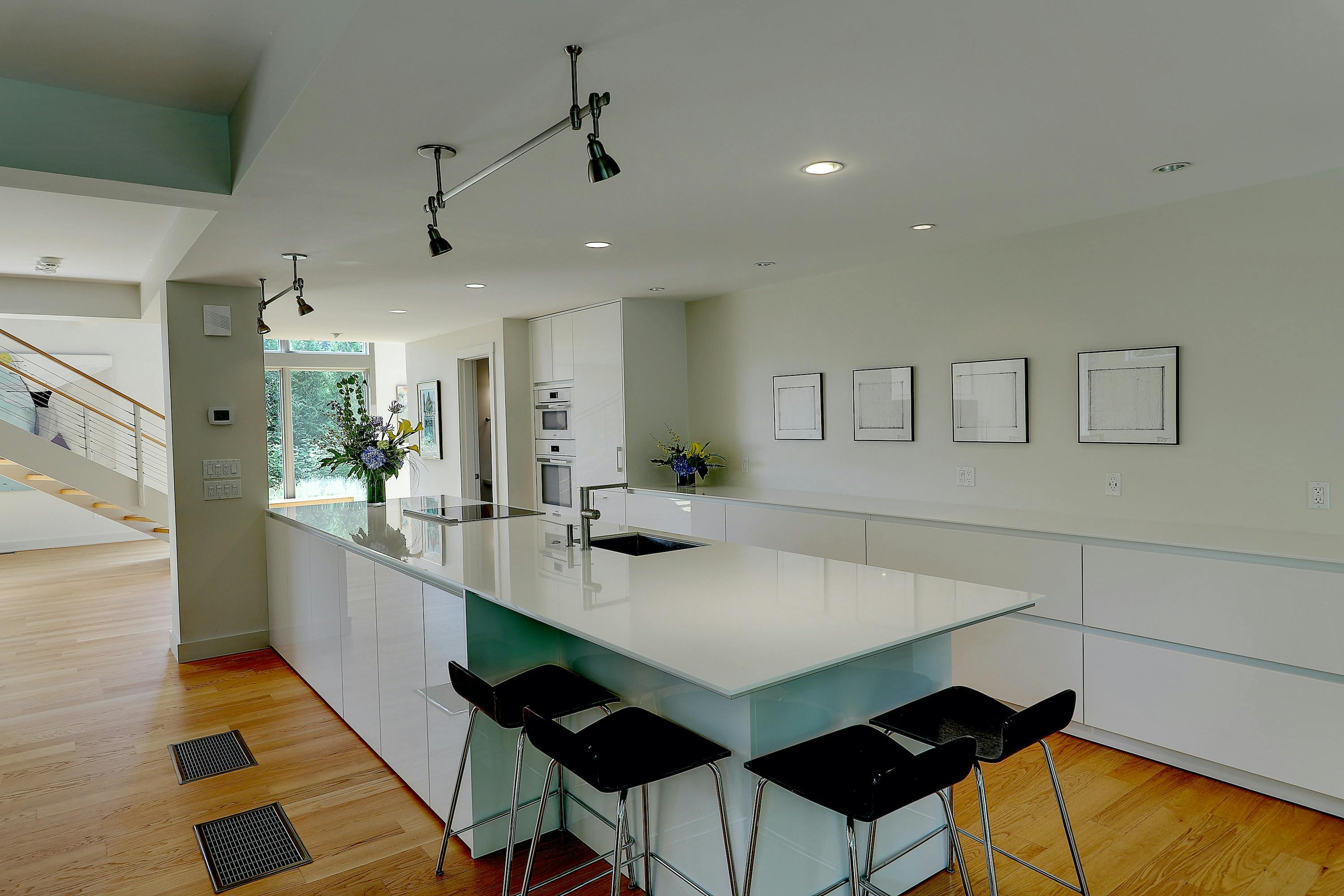The open interior with a European kitchen is surrounded by walls of glass blending it seamlessly with the stylish outdoor living spaces featuring a firepit and bluestone patio.