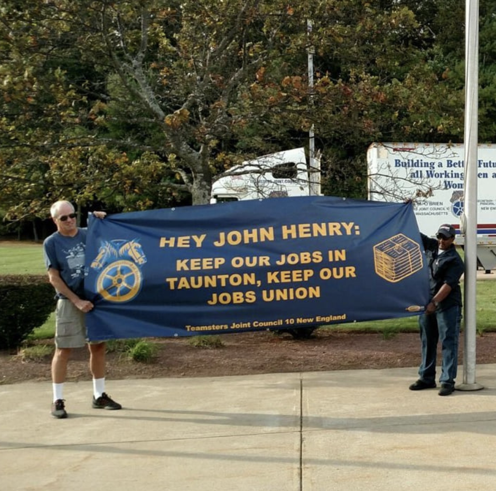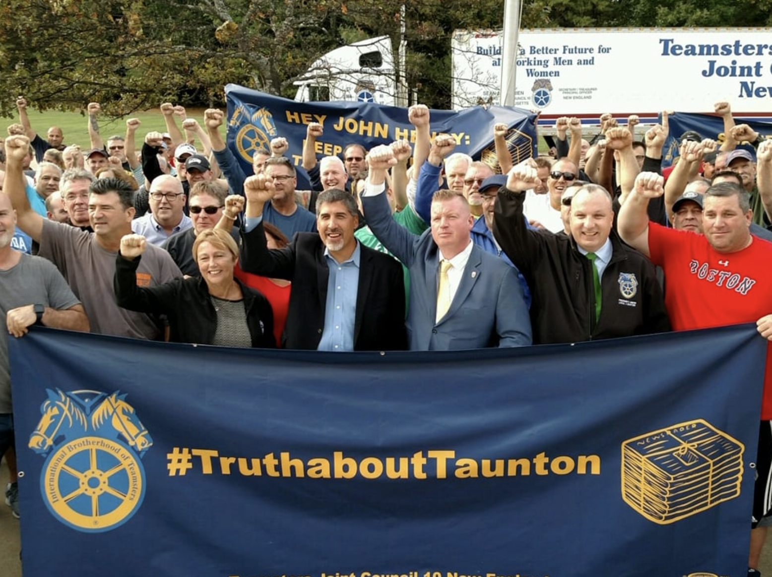“TEAMSTERS LOCAL 1 RALLIES AGAINST BOSTON GLOBE OUTSOURCIING SCHEME -- Members of Teamsters Local 1 were joined by Local 25 Globe drivers, Mike Vartabedian of the Machinists and Steve Sullivan President of GCC IBT Local 3 to protest a plan to outsource Teamster work. Local 1 President Mary White addressed the crowd and promised to fight Globe owner John Henry's most recent attempt to undermine good middle class jobs in New England,” said Teamsters Local 10 in a Facebook post.