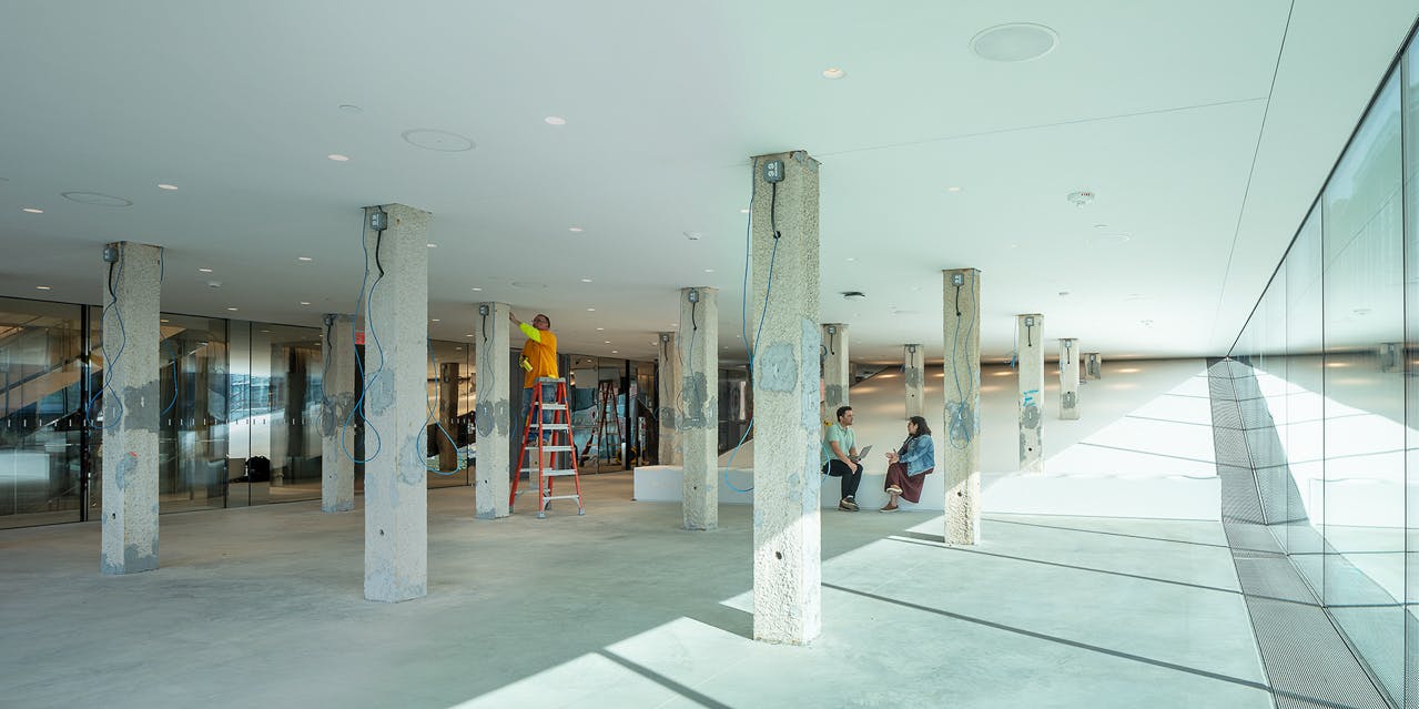 The lobby is an extension of the one uplifting element of the PCA, the so-called Clearstory (a pun on the architectural term clerestory?). Visually, this extended-out walkway acts like a plinth, or base, for the fluted cube and gives the white box a stately presence. Compared to the constricted lobby, the cantilevered walkway perched above Angell Street is the place for patrons to stroll, to see, and be seen. Ramos assigns glazing an important role in connecting the PAC with the rest of the Brown, declaring that “all intellectual campus life will bleed into the building.” This glassed-in promenade is the best part of the building, but it, too, has a dark underneath side, suitable for skateboarding, as a makeshift shelter for the homeless, and a place where, as Michelangelo argued against dark spaces at St. Peter’s, nuns could be raped.