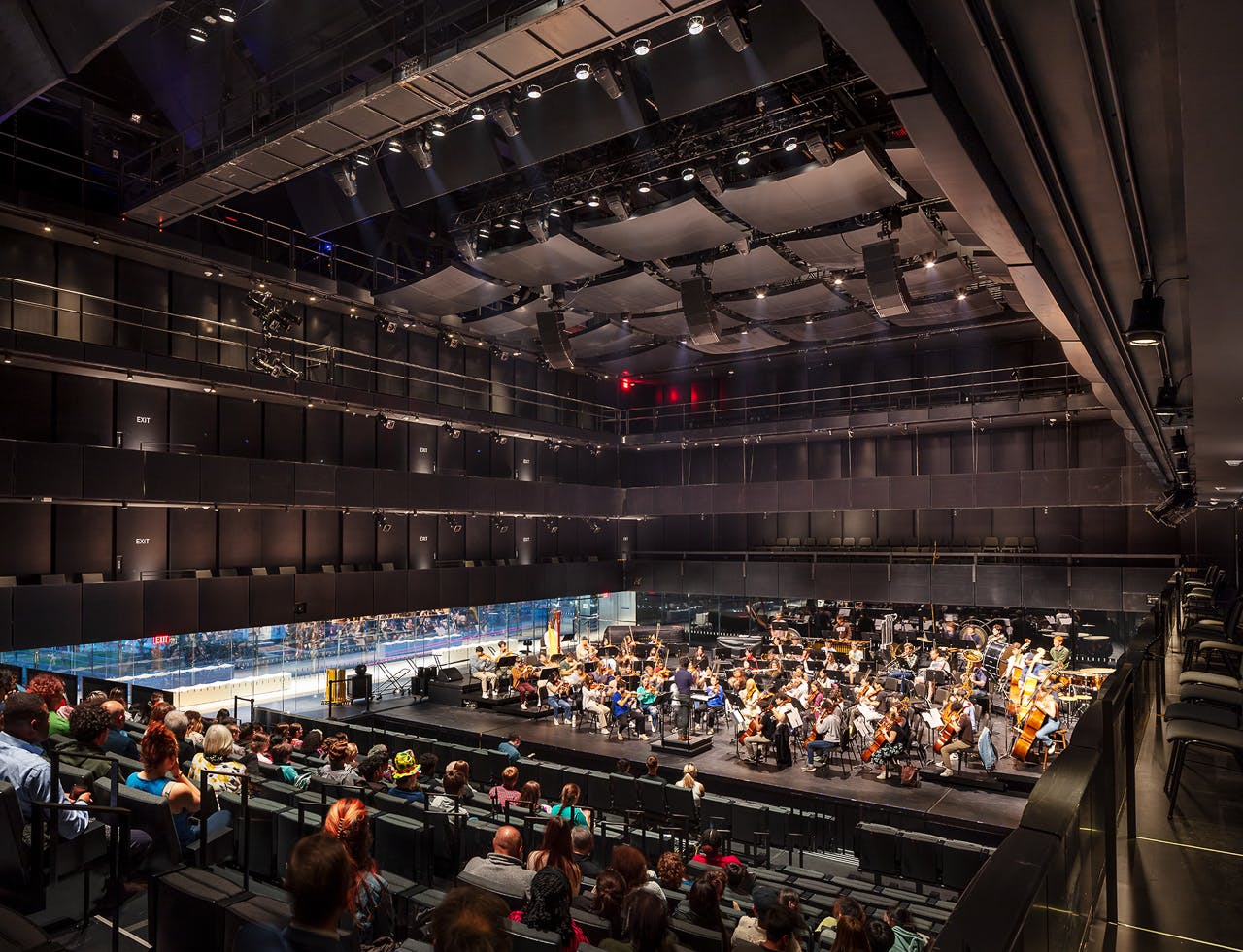 The Lindemann is a remarkable achievement in terms of its facilities. The bulk of the white box on Angell Street packages a dramatic and “radically flexible” performance space that has movable walls and five “radically different stage types.” The 40-foot-tall hall can seat an audience of over 500 for concerts by the 100-member Brown Symphony Orchestra, or it can be made smaller for opera, dance, or theatre. Acoustically, this giant, column-less “black box” can be fine-tuned, even during a performance. In short, the PAC has all the mechanical wizardly and performance-related toys one could ever wish for.