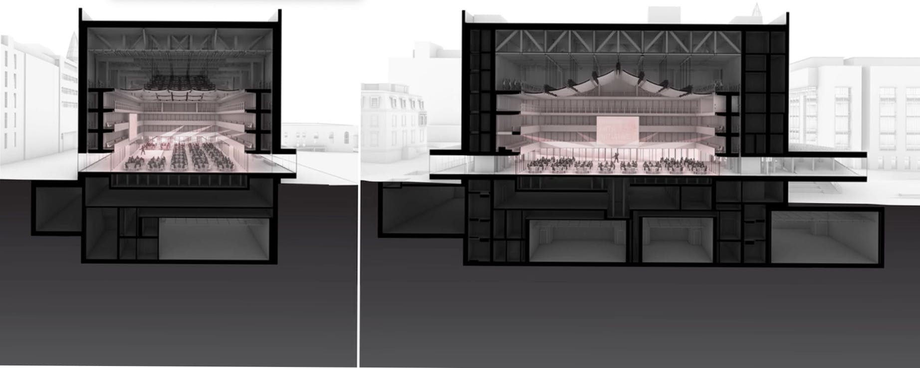 The space will be adjustable with seating gantries, retractable acoustic curtains, and stage lifts, so that Brown ought to be able to do almost anything with performance art from traditional to experimental. In its various guises there can be 350 seats for recitals, 250 seats for dance, drama, and opera, and as many as 650 attendees for a full orchestra. The massive superstructure needed to carry all this wizardry requires complicated machinery and a lot of manpower; configuration changes take ten seconds on the architect’s website, but four days in real-time.