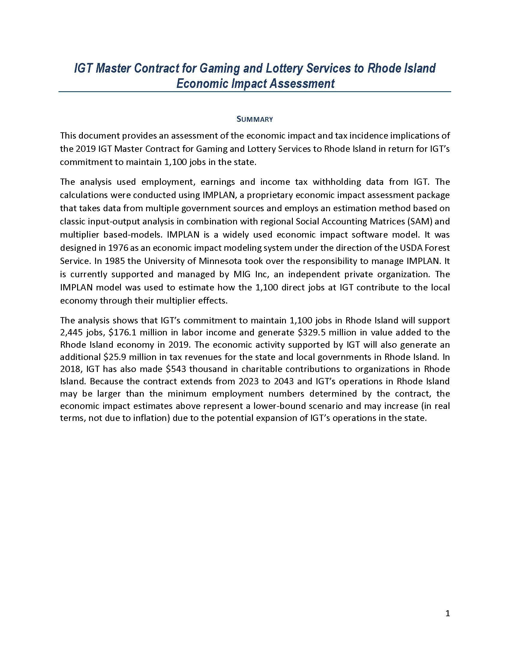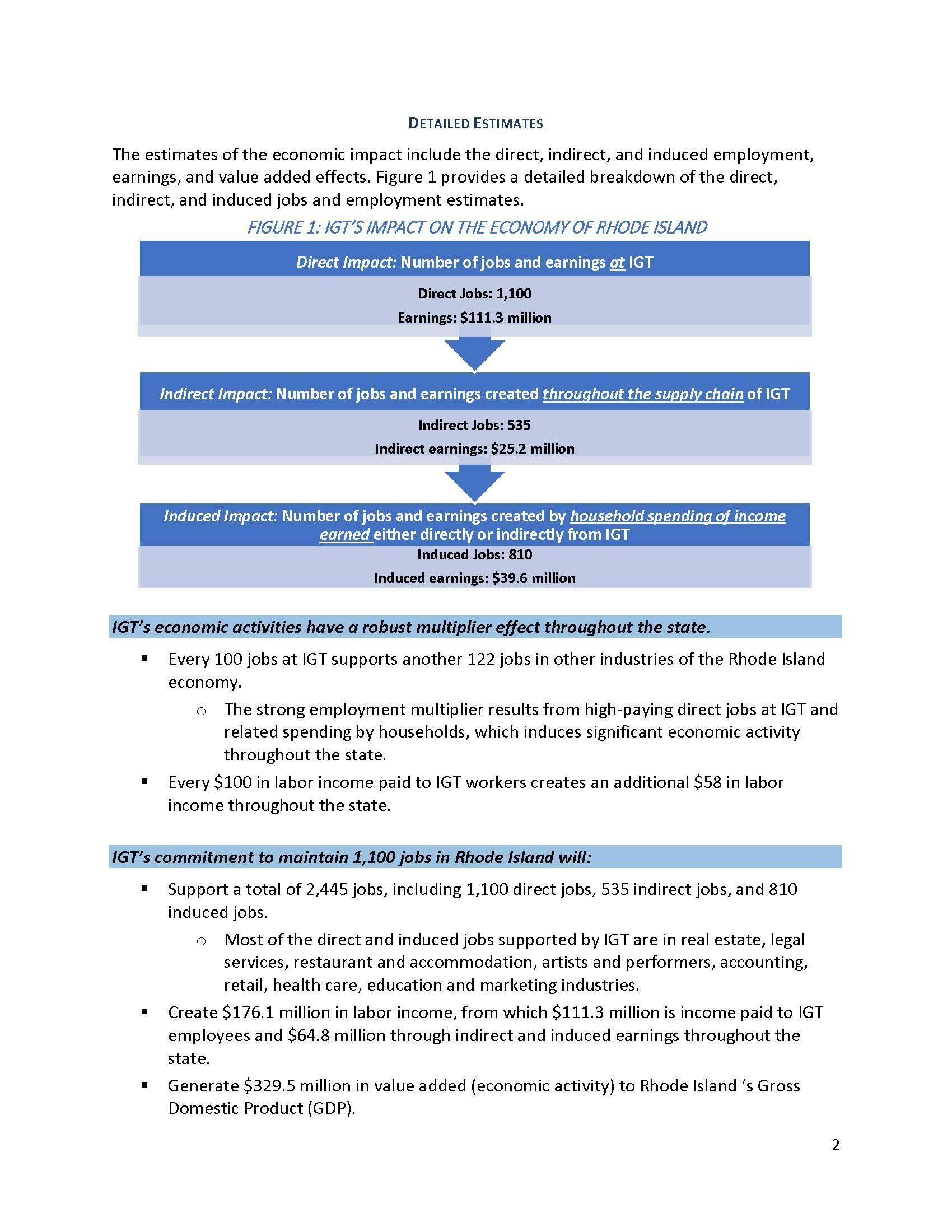 "Because the proposed contract extends from 2023 to 2043 and IGT’s operations in Rhode Island may be larger than the minimum employment numbers determined by the contract, the economic impact estimates above represent a lower-bound scenario and may increase (in real terms, not due to inflation) due to the potential expansion of IGT’s operations in the state," said IGT in a release.