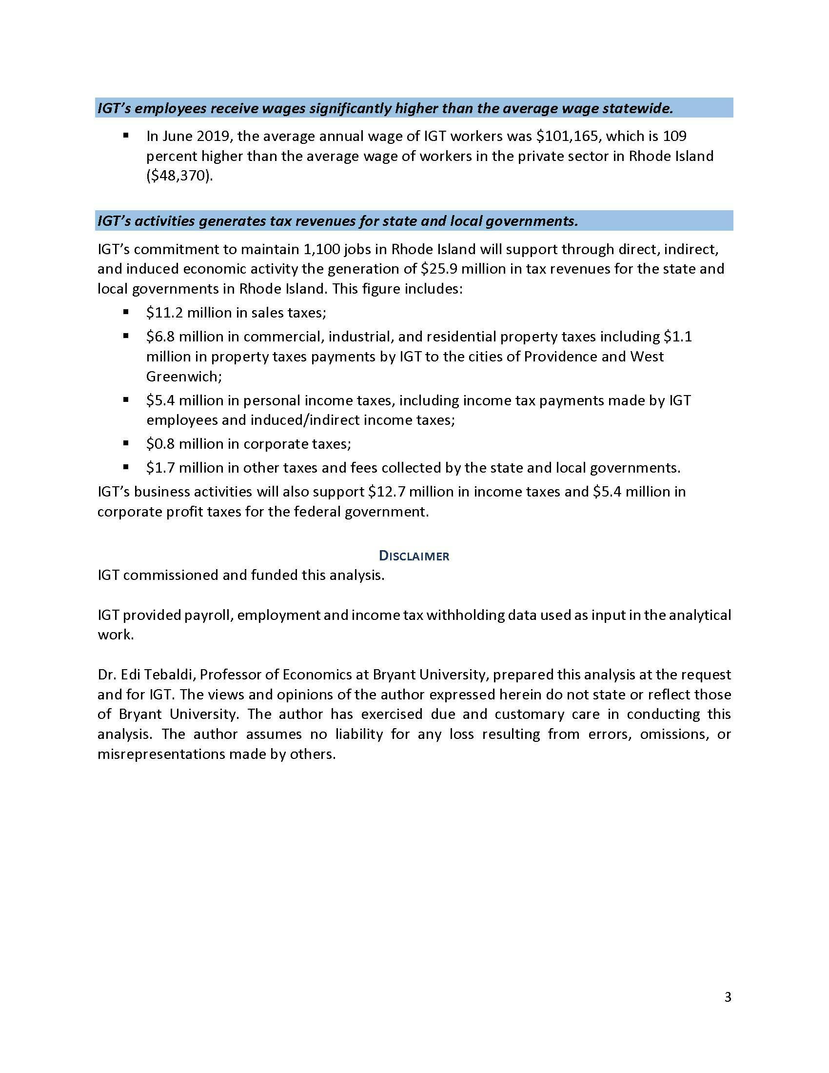 - IGT provided payroll, employment and income tax withholding data used as input in the analytical work. Dr. Edi Tebaldi, Professor of Economics at Bryant University, prepared this analysis at the request and for IGT.