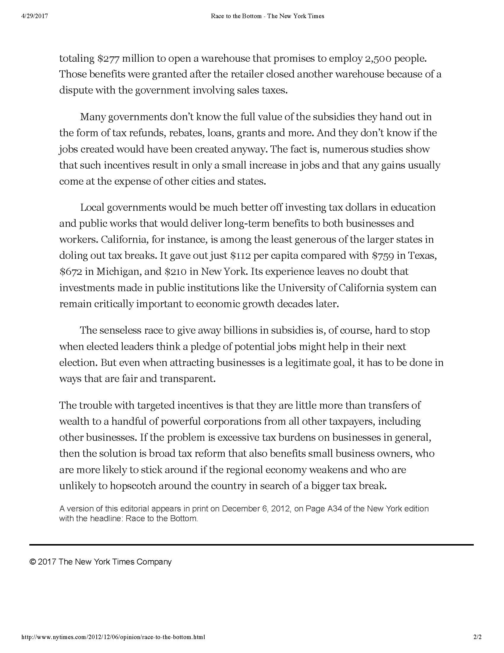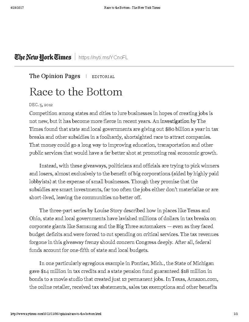 The Times wrote that, "The senseless race to give away billions in subsidies is, of course, hard to stop when elected leaders think a pledge of potential jobs might help in their next election."