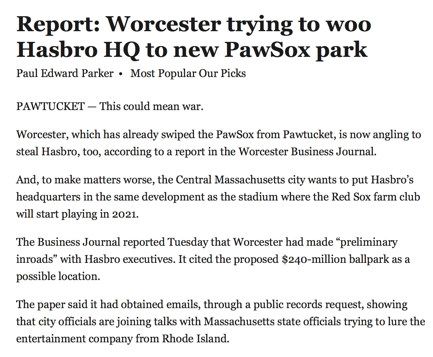 “The City of Worcester is not formally pursuing Hasbro nor has any City employee had any direct contact with a Hasbro representative. The extent of the City’s solicitation was a communication from Assistant Chief Development Officer Peter Dunn to the Massachusetts Office of Business Development, in which he stated that should the commonwealth be engaging Hasbro in dialogue; the City of Worcester would be interested in participating. There have been no further conversations or developments on the matter.”