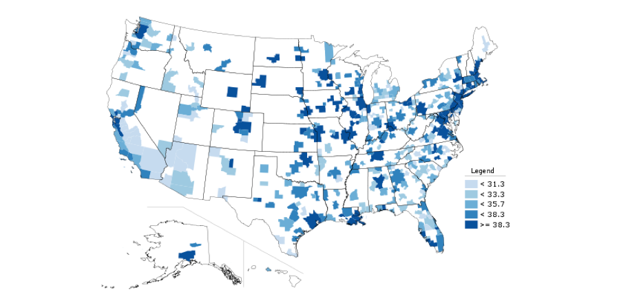 Unsurprisingly then, New England per capita personal incomes adjusted for purchasing power parity look reasonable good. Here’s the national map: