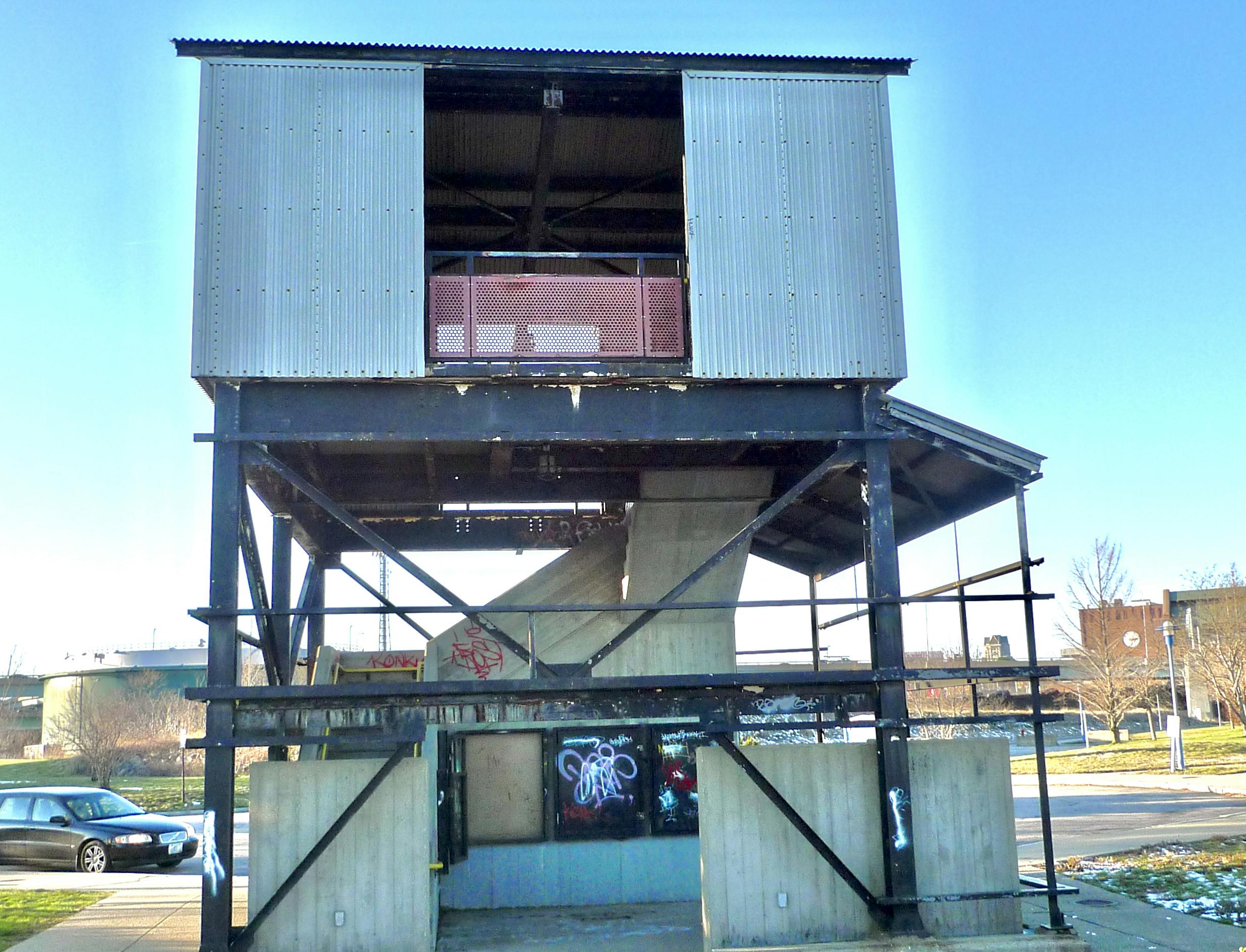 Warner developed the abandoned coal delivery system into a series of sculptural objects that work as historical reminders as well as abstract pieces of art. When Providence trolleys were electrified in 1895, coal to create the electricity to power them was unloaded from the last generation of working schooners (there was a repair yard for sailing ships close by).
