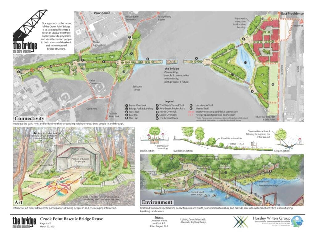The Crook Point Bascule Bridge is a steel railway drawbridge that once connected Providence’s Fox Point neighborhood to the City of East Providence across the Seekonk River. The bridge has been stuck in the upright position since 1976 when the bridge and tunnel were abandoned.