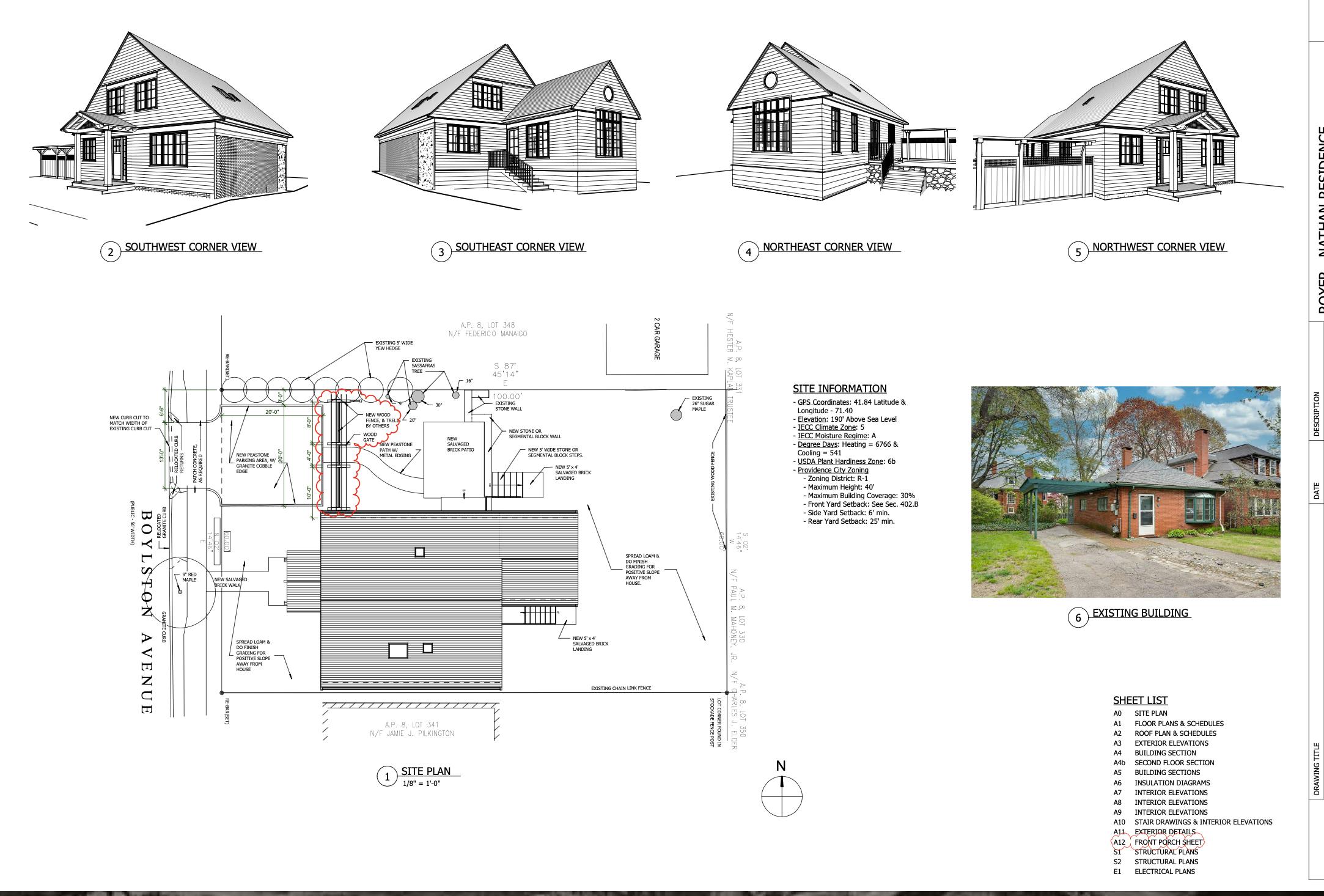 19 Boylston Avenue: elevations, site plan, and the earlier house. Royer Architects
