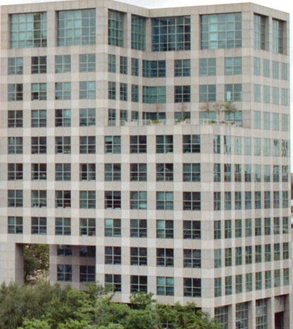 1985. Edward Larrabee Barnes. Dr. Downtown suspects that this building was designed to punish local preservationists who fought a quasi-Georgian postmodernist earlier version that blocked views of South Main Street from downtown. Notwithstanding the Packet “precedent,” it is ridiculously noncontextual, but its cubic form with cubes cut out of its top and bottom quadrants fulfills modernist aesthetic aspirations better than most modernist buildings. The conventional reaction to Old Stone Square is that it should be somewhere else.