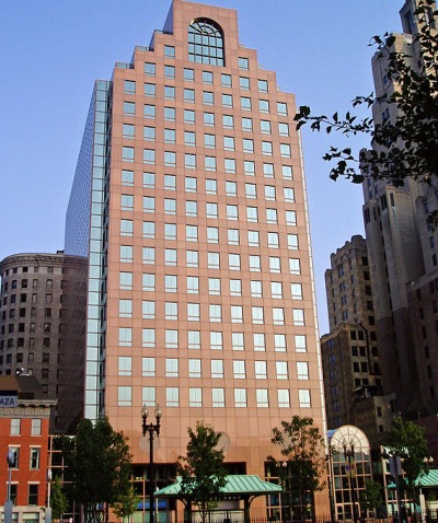 1985. Helmut, Obata & Kassebaum (HOK). Designed by a firm better known for designing sports stadiums, the Fleet Center (not to be confused with the sports arena in Boston) features a stepped crown often cited as evidence of its postmodernist style. Its inset windows on two sides are also postmodern compared with the glass curtain wall of its other two sides. Yet its postmodernism is overridden by its modernism. Still, modernism looks best from a distance. Jumbled together with the Textron, the Hospital Trust Tower and the Industrial Trust (“Superman”) Building, the Fleet Center contributes to Providence’s imposing skyline.