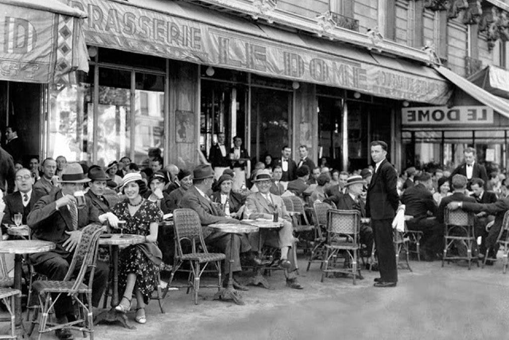 Europeans have always been dining outdoors, it seems. Imagine Rome, Berlin, or Vienna without café society. The Paris sidewalk bistro was the crucible of the literary and artistic renaissance of the 1920s and the revolution of 1968, not to mention romantic movies exuding the aromas of coffee and cigarette smoke. Brasserie le Dôme in Paris in the 1920s, popular with such American literary lights as Ernest Hemingway, Henry Miller, and Sinclair Lewis.