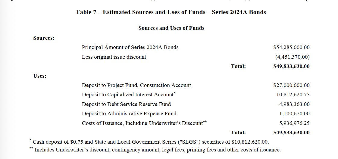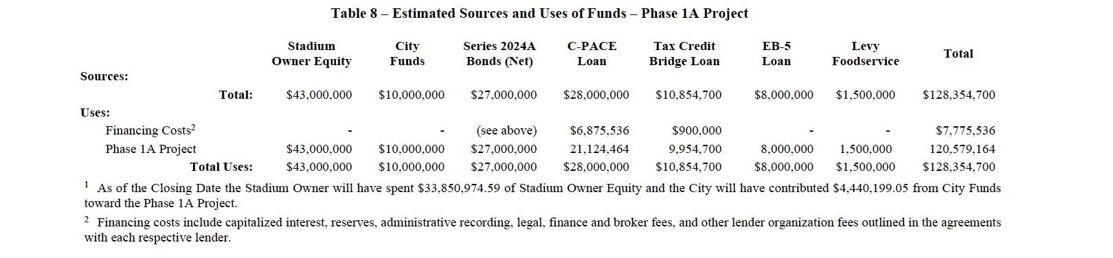 According to the use of Estimated Sources and Funds, the stadium owners -- Brett Johnson and his team -- are investing $43 million of the total cost, which exceeds $128 million.