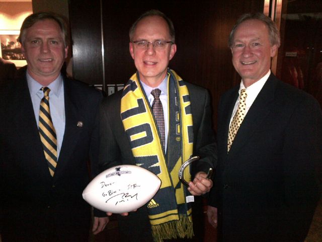 Back in January, Bennett and Chafee presented Bargar, a Michigan grad, with an autographed football from Patriots Quarterback Tom Brady as part of their ongoing effort to woo the airline to Rhode Island.
