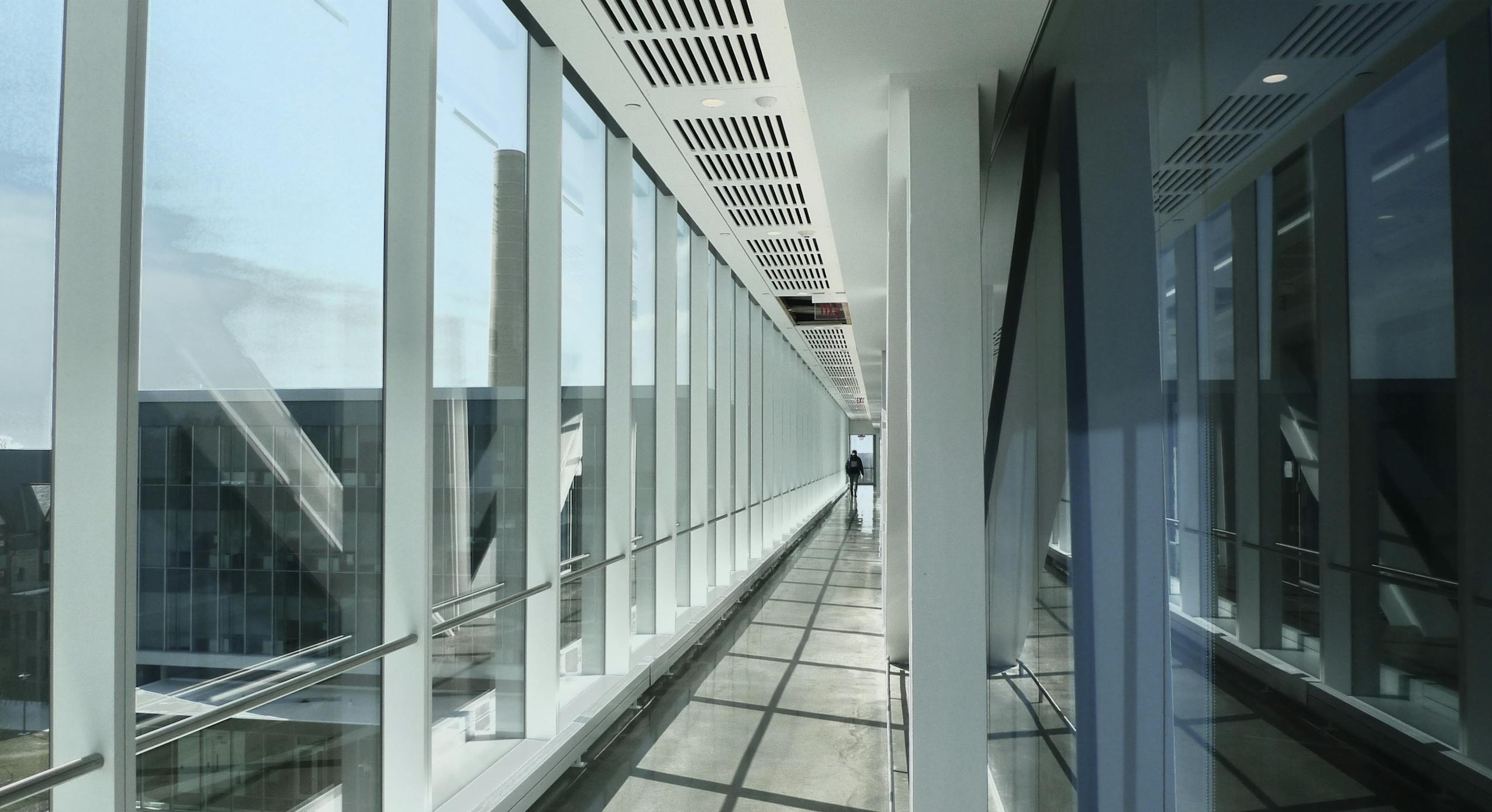 At URI, however, the emphasis on natural light transforms what might have been just another science building. Architect Steelman is particularly proud of the glazing that wraps the fifth floor. This unitized curtain wall has an acid-etched first surface and a white fret as the second surface. Light filtered through this scrim is ever changing.