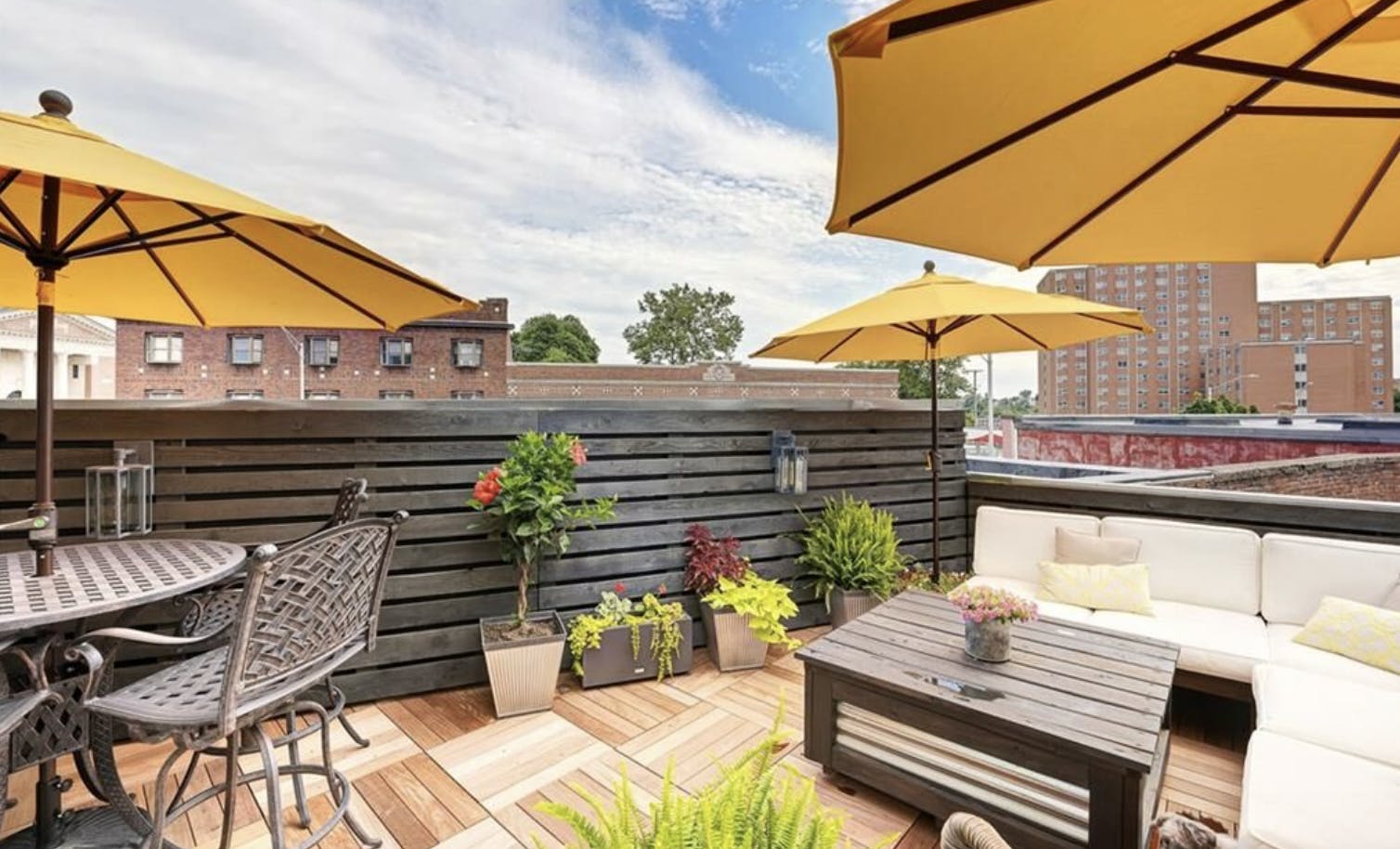 In addition to incredible light and soaring ceilings, the space features a dramatic pyramid skylight, a custom steel and concrete staircase, a true chef’s kitchen with marble and zinc countertops, 6 burner Thermador range with double ovens, and a private ipe wood terrace off the primary bedroom suite.