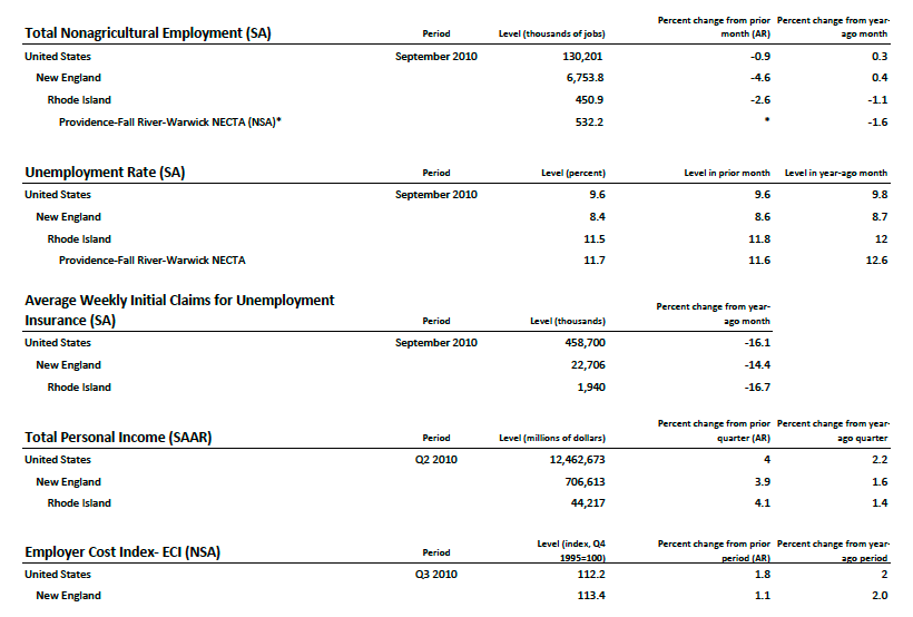 The Federal Reserve Bank of Boston issued the following numbers for the performance of the Rhode Island economy versus the rest of New England and in comparison to the United States.