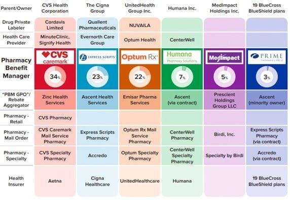 "PBMs are part of complex vertically integrated health care conglomerates, and the PBM industry is highly concentrated. As shown in the below image, this concentration and integration gives them significant power over the pharmaceutical supply chain. The percentages reflect the amount of prescriptions filled in the United States," said the FTC.