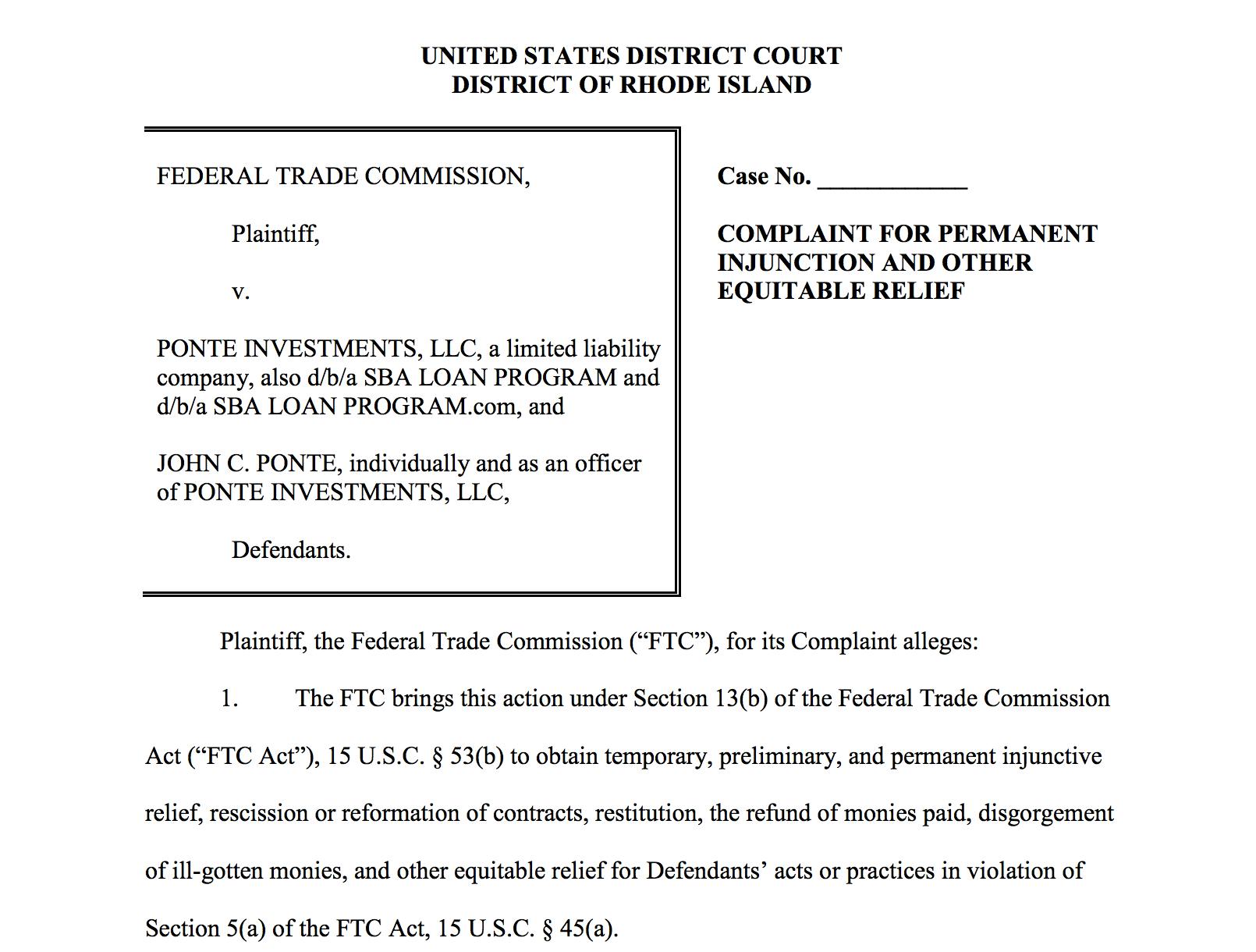 FTC Files Complaint to Stop RI Company From Posing as SBA Lender and 'Preying on Small Businesses'
