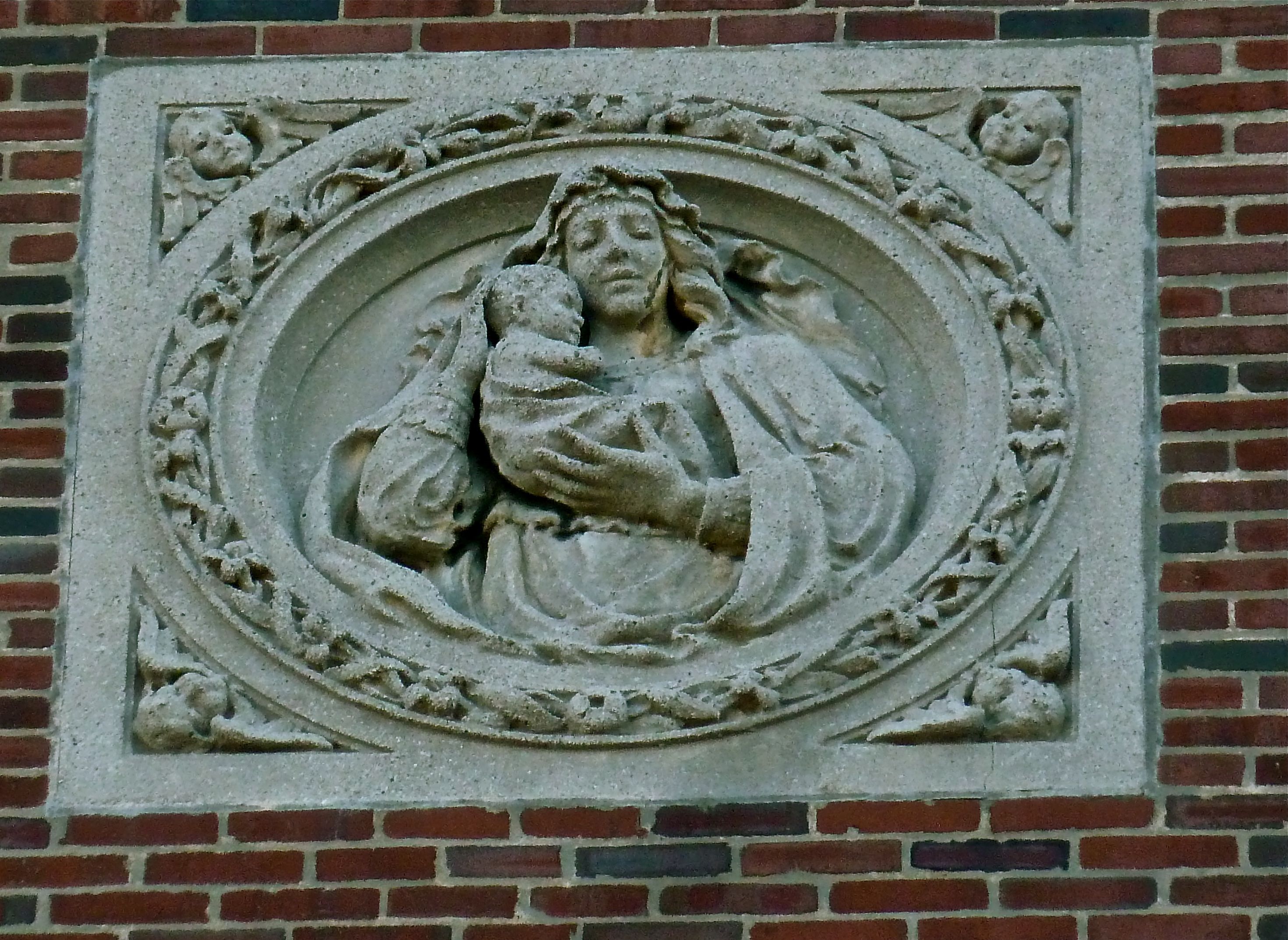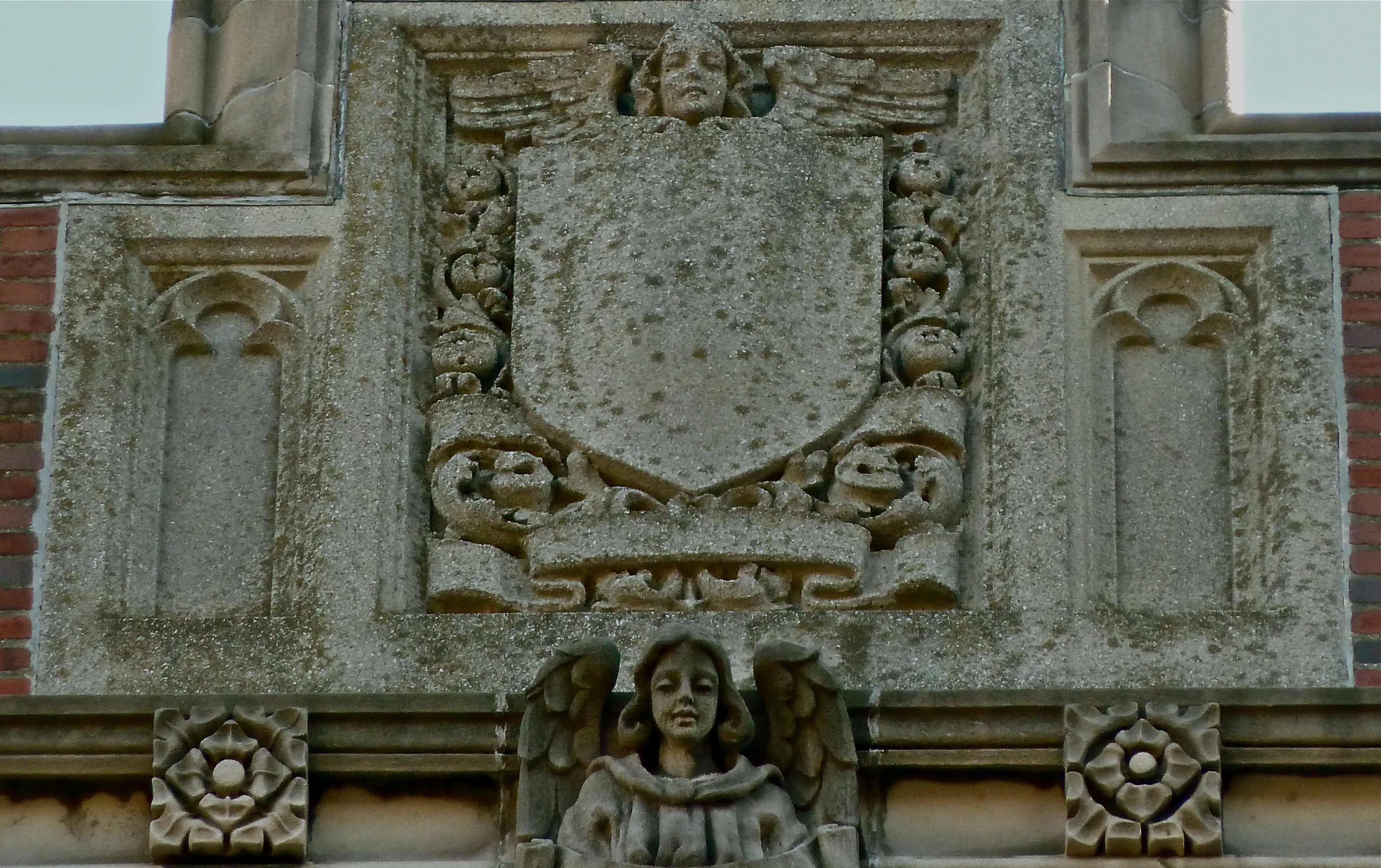 Elaborate stone carving also appears on the grand old Lying-In Hospital in Elmhurst. Because it is a little hard to see from such a great distance, this could be cast concrete, in which case it might not be unique to this obstetrical hospital. Either way, it offers an aura of Oxford and Cambridge, with its angels, seraphim, and Tudor roses.