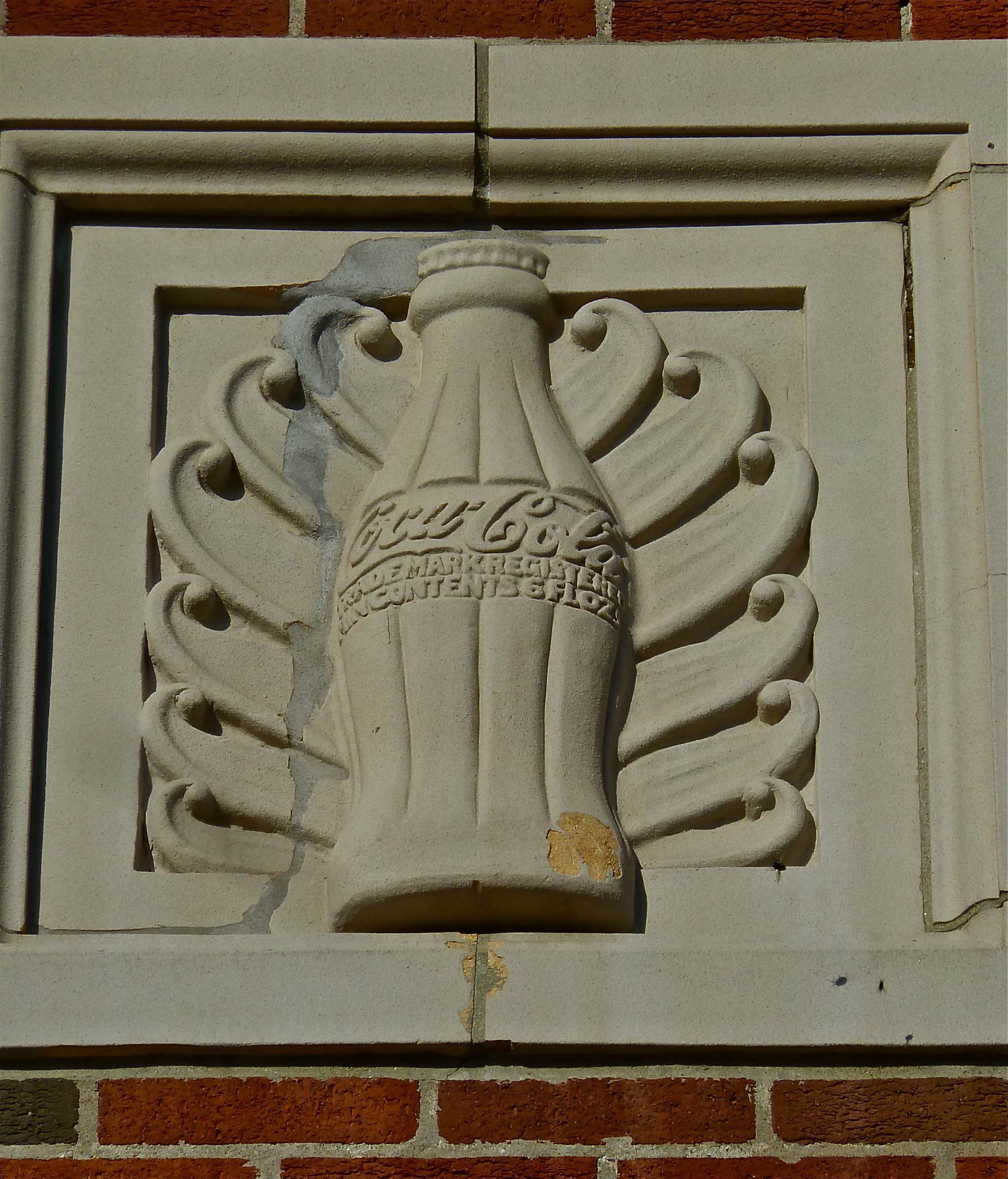 Fired clay remained the choice for corporate medallions attached to buildings, but the unbridled riot of exuberance was gone. This bottle identifier was used on Coca-Cola bottling plants across the country, just as the buildings' designs came out of corporate headquarters in Atlanta. The plant on Pleasant Valley Parkway was built in 1939, just before the conflagration that would deal another blow to hand-built, hand-decorated, and individually crafted architectural ornament.