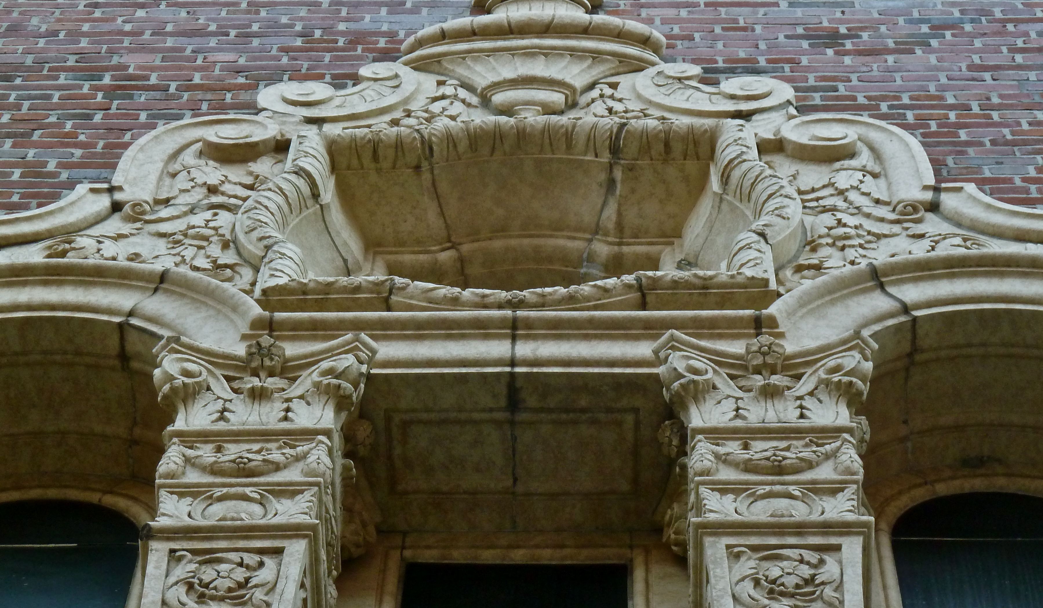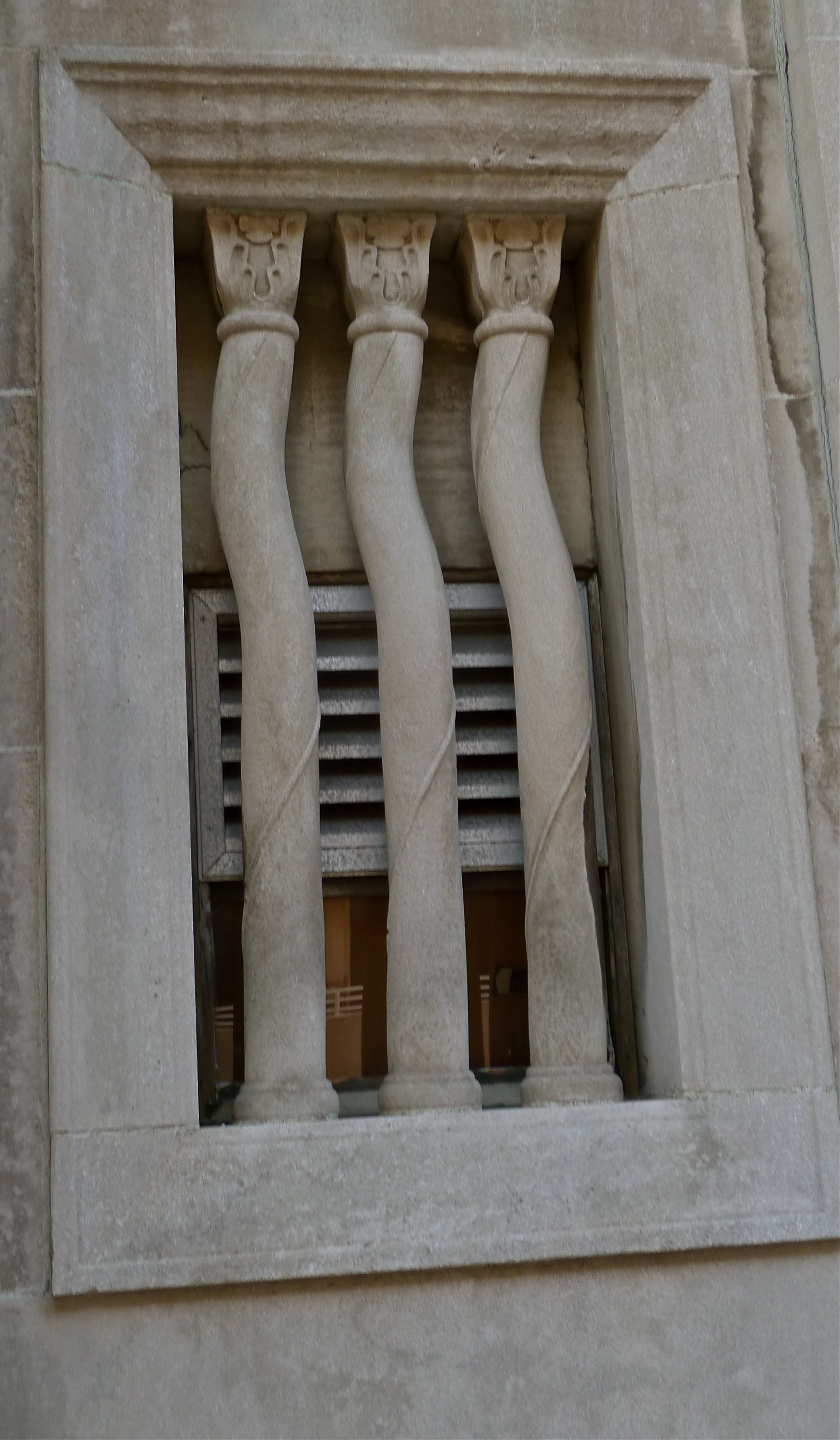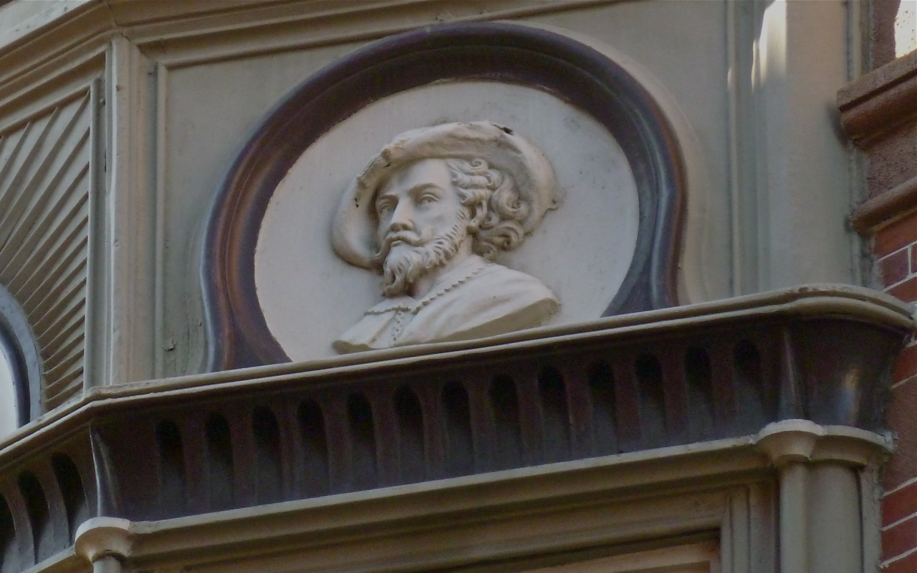 Way up is this roundel, with the bas-relief of a swashbuckling man. Perhaps he is a famous painter, such as Peter Paul Rubens. Or a musician. (Wagner would be appropriate for the period.) More prosaic, he may be the Conrad Building's patron, Jerothmul Barnaby.