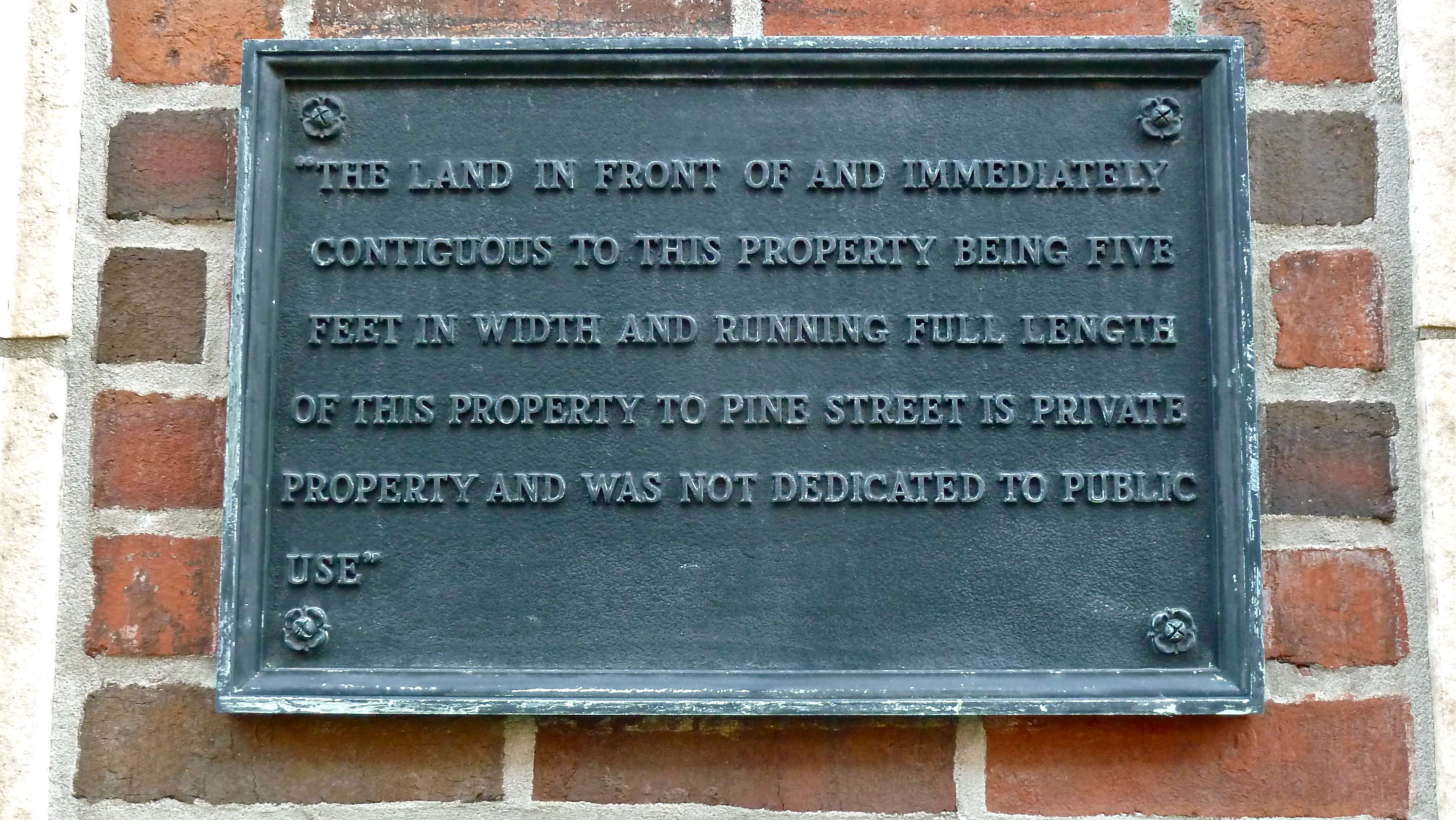 The long, less public, side of the theatre is a brick wall with various medallions plastered on in strategic places. But what one does not expect to find is this eye-level bronze plaque, which curiously declares that a five-feet-wide strip of land is private property. Whose? Why? What odd tale of family squabble or legal wrangling led to the casting of this sign, but not to the welcoming passage of the public's feet.