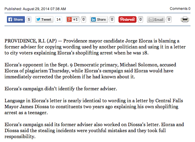AP story appeared in Prov JournalAn exclusive report published Thursday evening by the investigative team of GoLocalProv.com about Providence Democratic Mayoral candidate plagiarizing a letter from another politician in Rhode Island, was rewritten and distributed by the Associated Press with out attribution.