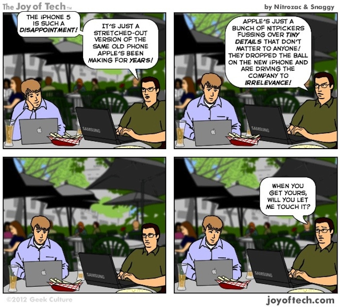 If you’re thinking about buying one, you don’t really have much of a chance not to. The allure of Apple’s products, from the earliest Macs through the iPod, iPhone, and iPad, is such that you’ll buy one or, if you buy something like it, you’ll spend much of your time explaining to others and to yourself why you didn’t buy an Apple product. Your reasoning might be solid, but consumer purchases are rarely about reason. You may end up like the fellow in the comic below.