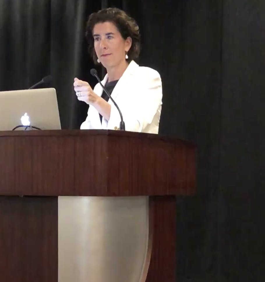Raimondo’s 15-minute speech was a mix of re-election high points - record employment and cranes in the sky — coupled with a context of her business experience.