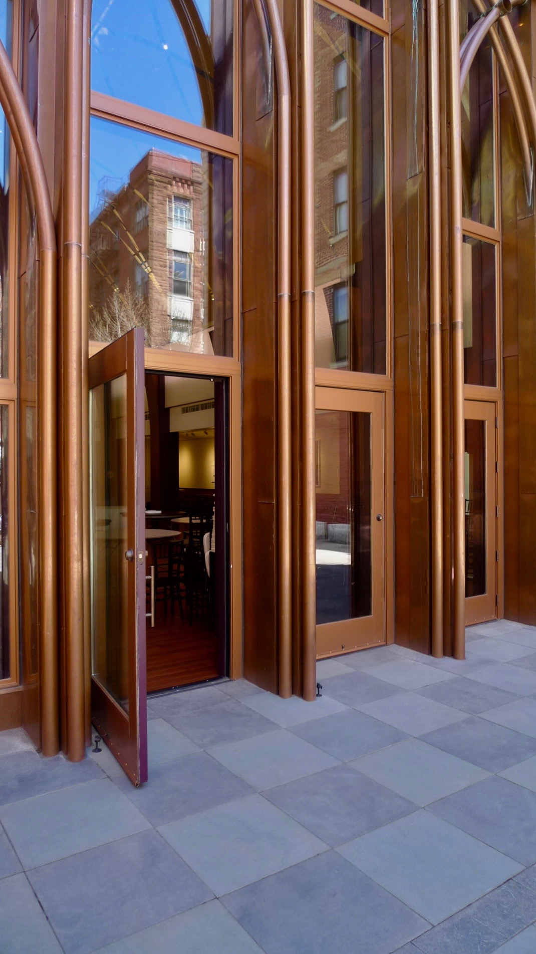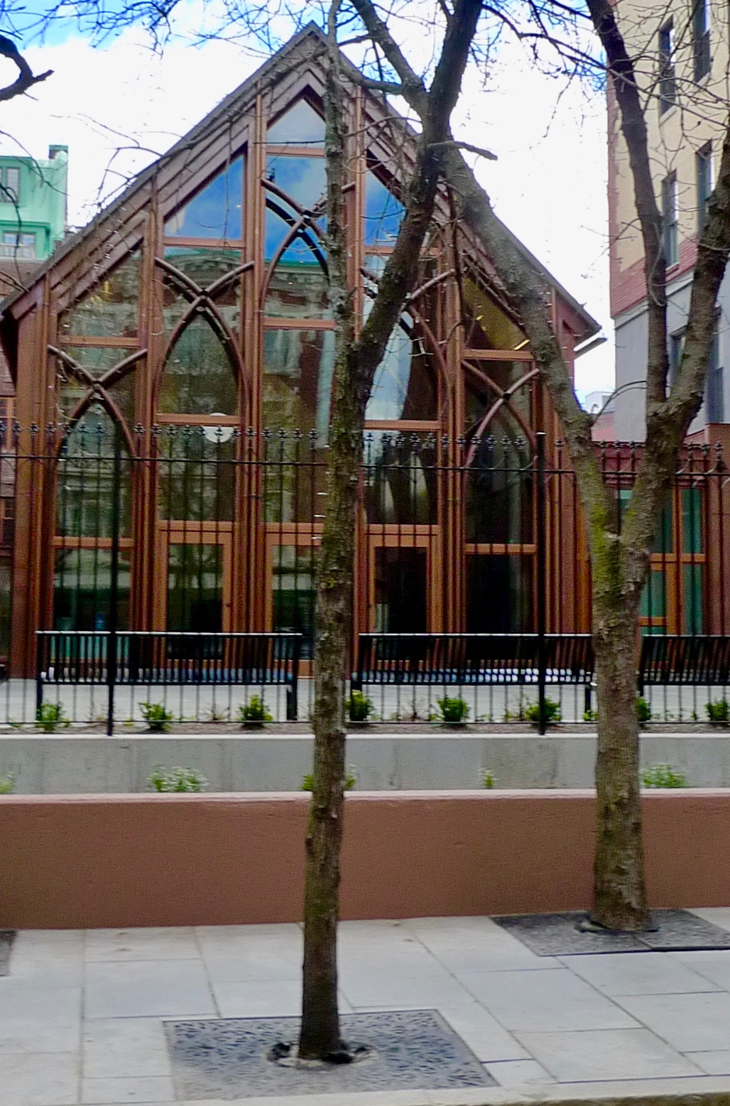 The exterior of the Grace Church pavilion, with its peaked gable and copper tracery is a felicitous solution to grafting onto a significant piece of architecture and maintaining the streetscape.