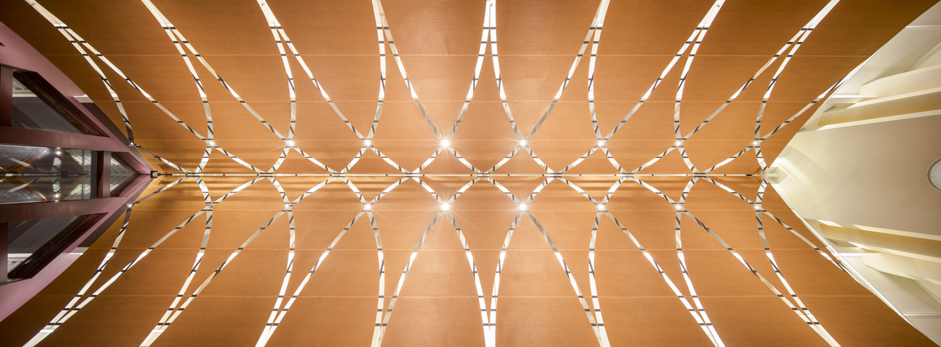 What is most striking is the way the ceiling has been sliced apart, as if it were a schematic diagram of the ribs of Chartres or Salisbury cathedrals.