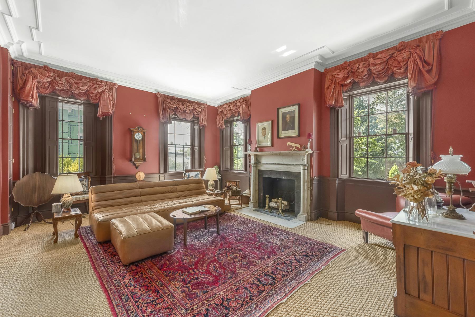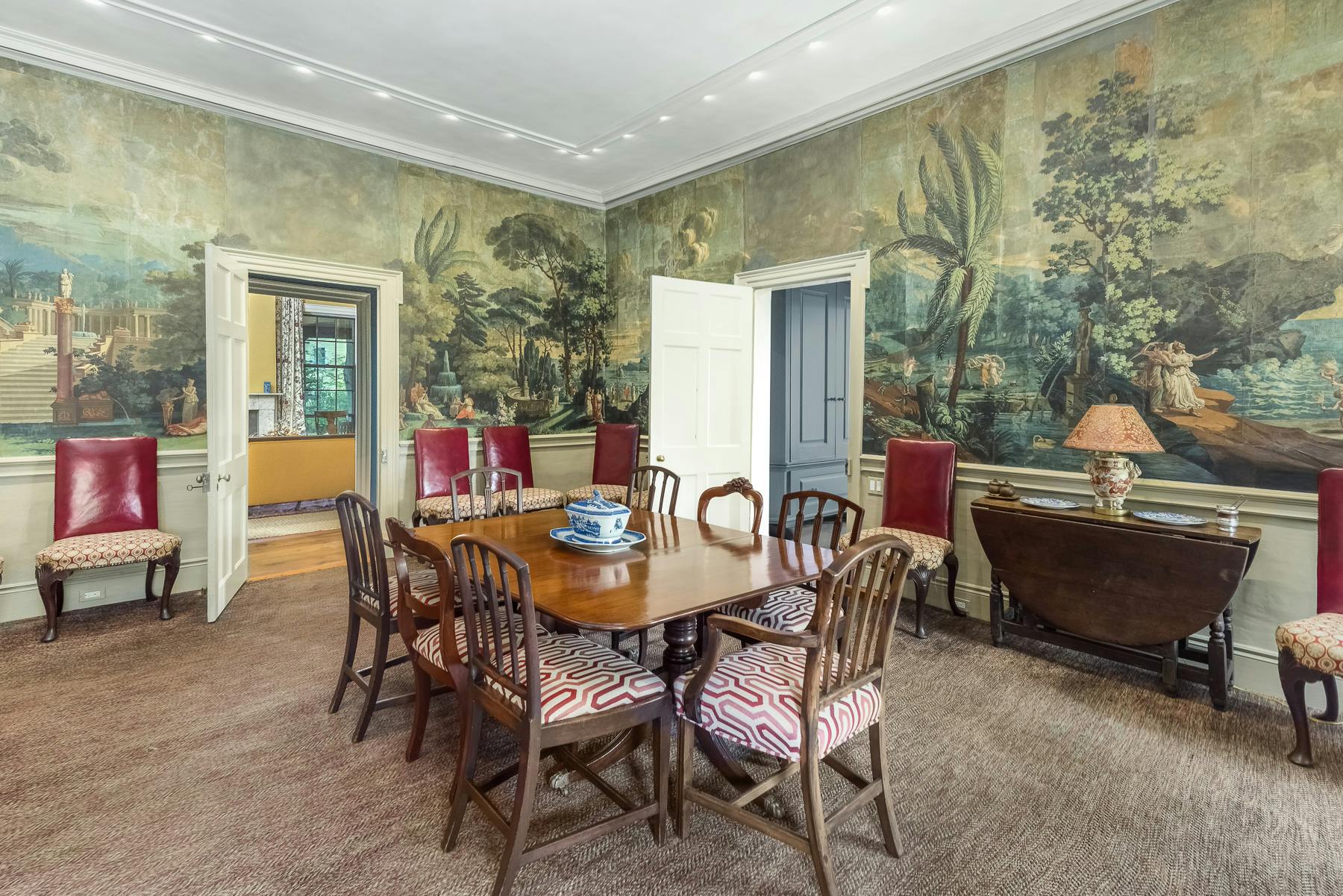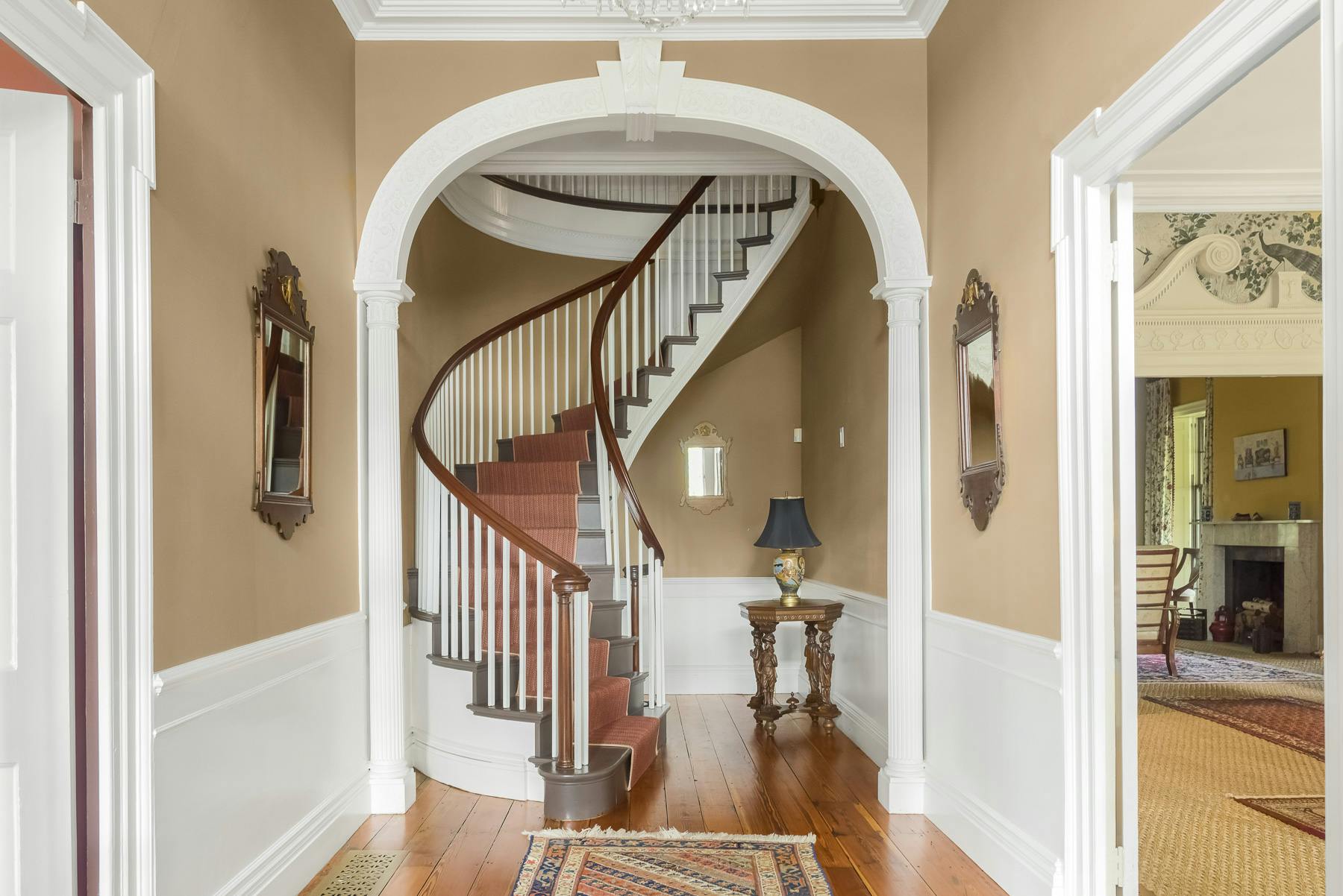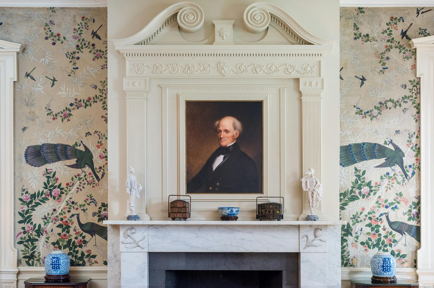 The estate remained in the family for three generations. Today, the home is one of Providence's loveliest examples of the era, with welcoming rooms including a dramatic entrance with a curved staircase, an exquisite dining room with rare French wallpaper by Dufour, impressive "peacock" wallpaper made in China in the living room (the peacock became the Carrington family crest), significant two-story home office, chef's kitchen, and large primary suite.