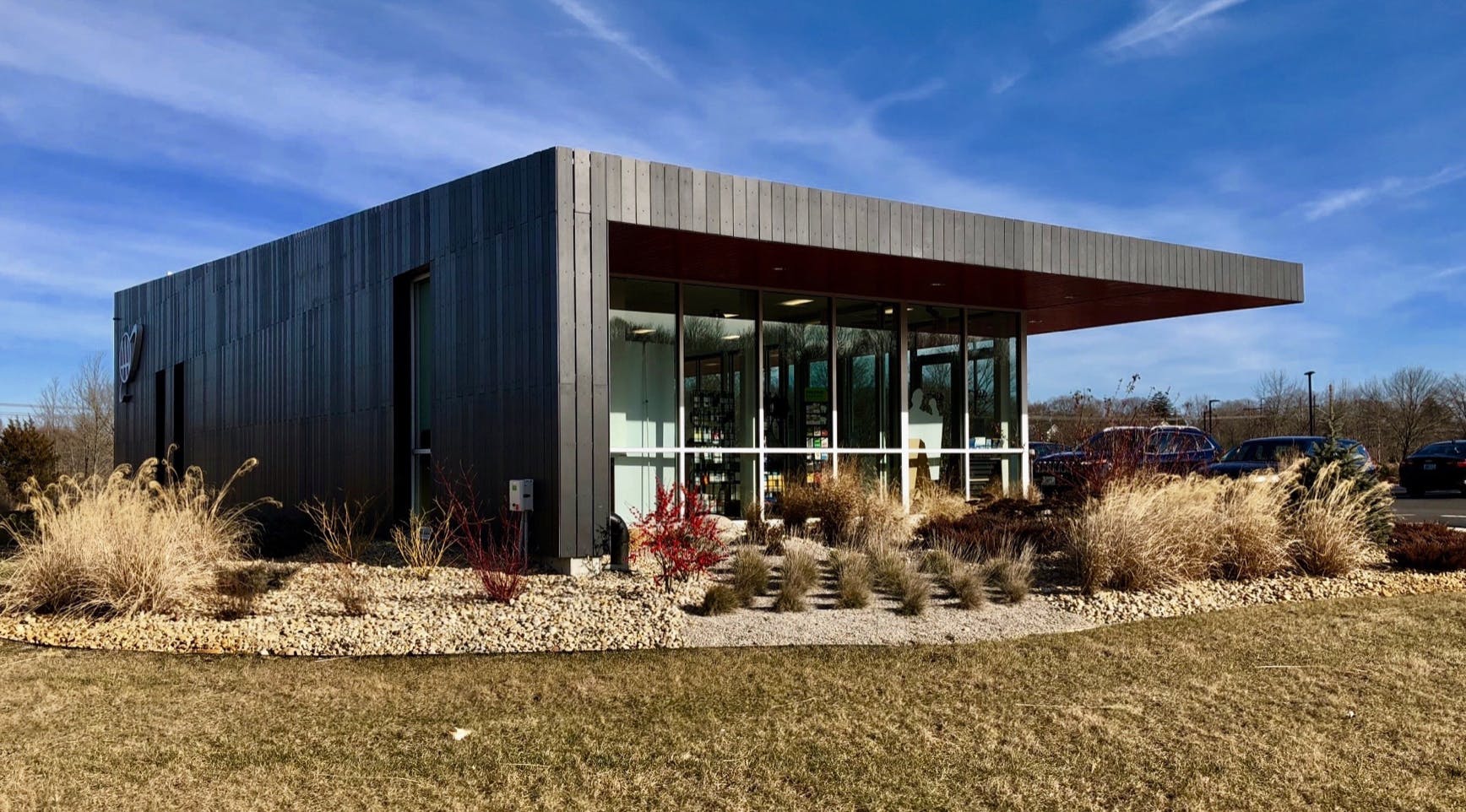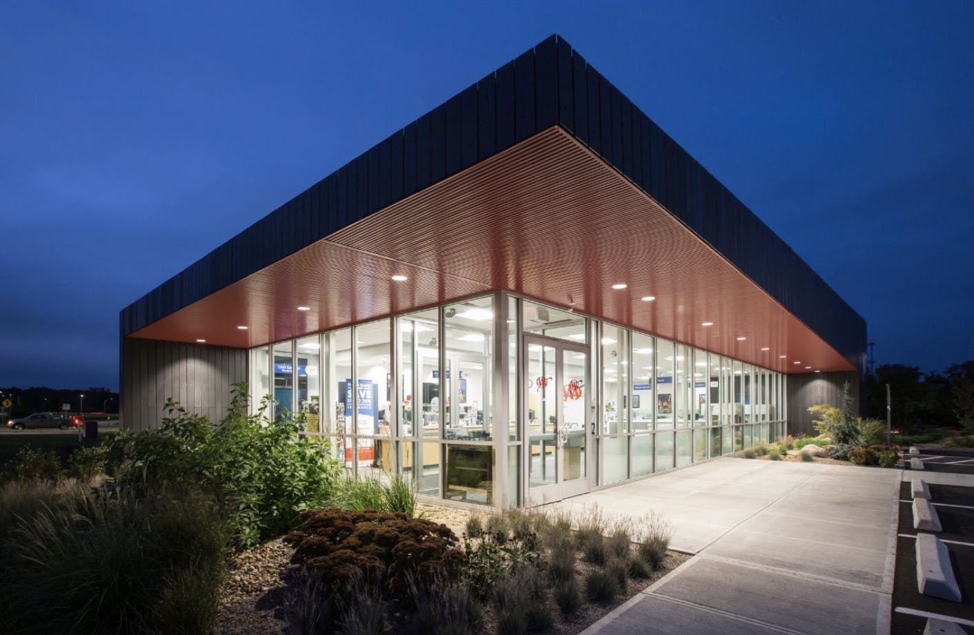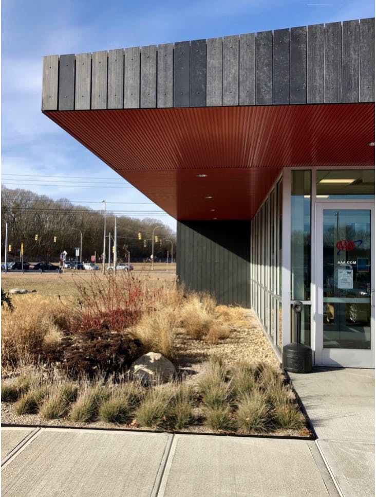 The architects pitched the idea that the branch would be freestanding; it would also be a low-mass building, not unlike a 1950s-era drive-in restaurant. StudioMEJA wanted to make a visual impact when seen from Wampanoag Trail at 50 miles per hour, and yet have the office be welcoming to visitors.
