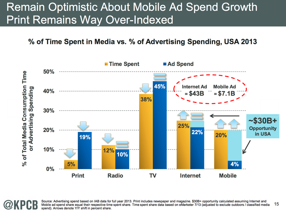 Specifically, in her annual "State of the Internet: KPCB, Internet 2014", Meeker outlines that both print and local broadcast television receive far more in advertising revenue then they have in audience and that these dollars will shift to mobile and online digital.