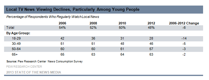 The biggest decline is 18-24 year-olds who have decreased their viewing by 14% from 2006 to 2012 - the most recent data period reported by Pew.