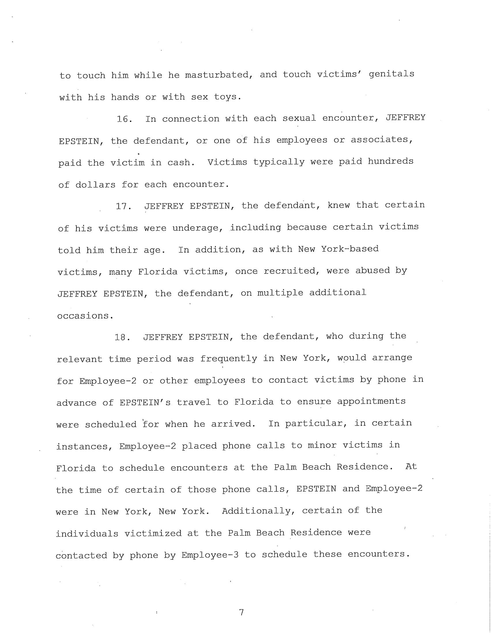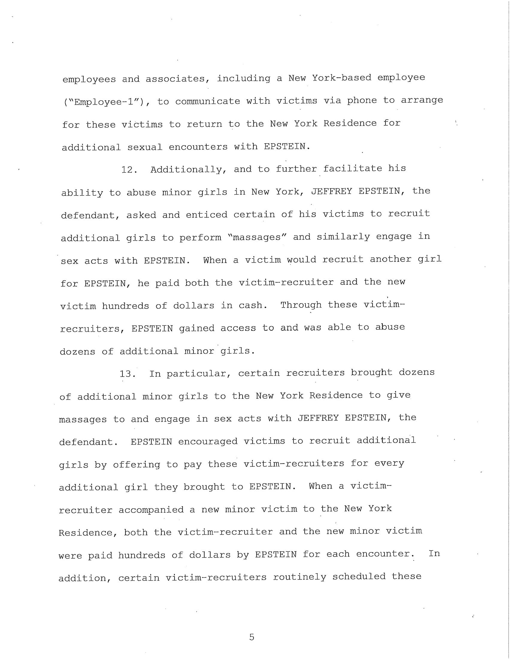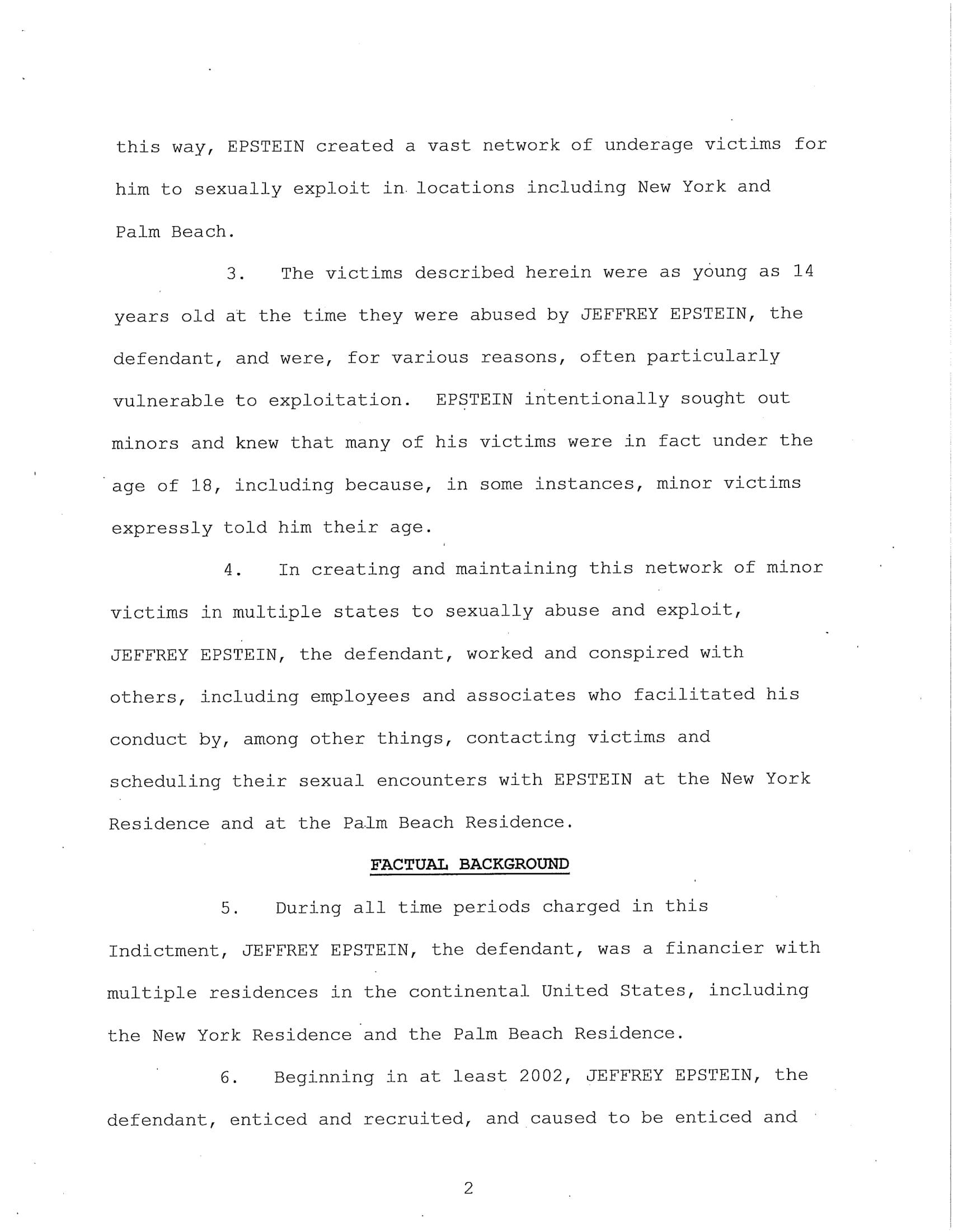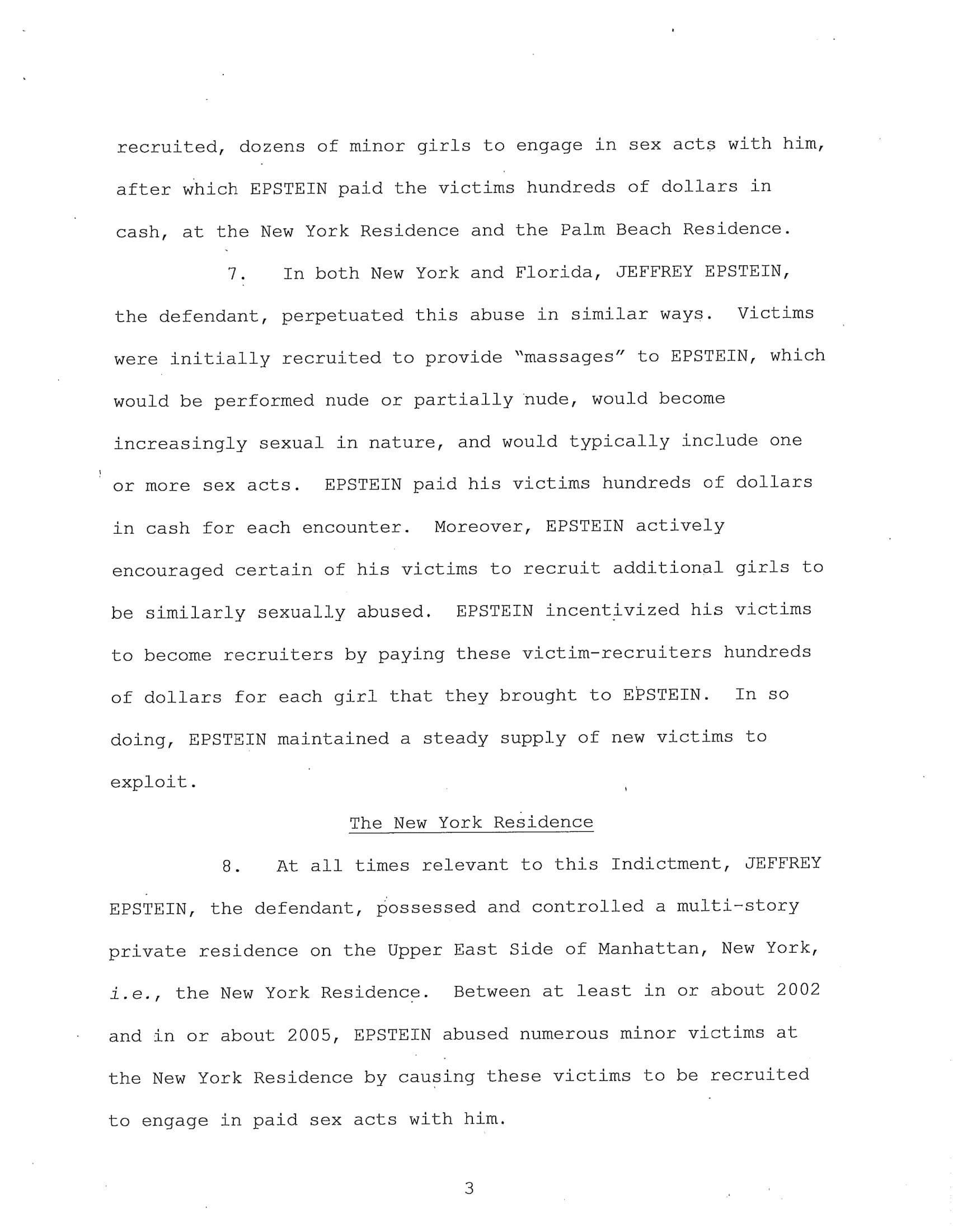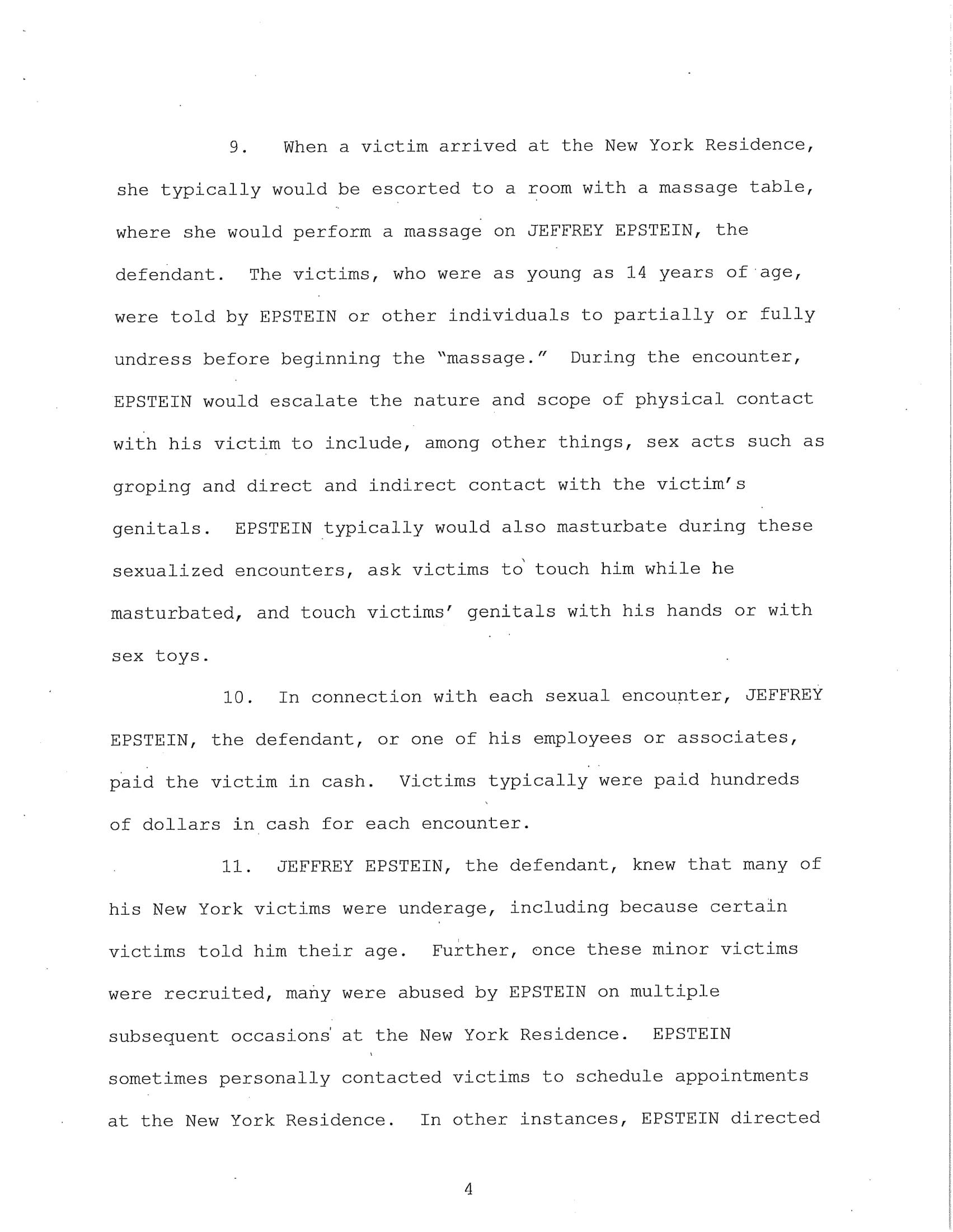 The federal indictment filed in June by the Department of Justice cited multiple cases of sexual abuse by Epstein, “In or about 2002, Minor Victim-1 was recruited to engage in sex acts with EPSTEIN and was repeatedly sexually abused by EPSTEIN at the New York Residence over a period of years and was paid hundreds of dollars for each encounter. EPSTEIN also encouraged and enticed Minor Victim-1 to recruit other girls to engage in paid sex acts, which she did. EPSTEIN asked Minor Victim-1 how old she was, and Minor Victim-1 answered truthfully.”